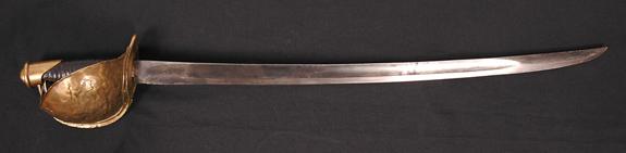 Civil War Naval Cutlass. Civil War model 1860 Navy cutlass dated on blade; "1862". On the other side of the blade is marked; "AMES MfG Co., CHICOPEE, MASS". 24½" single edge blade, 30½" overall length. Brass cup hilt is marked; "9 M', "327" and a large "77" on the outside of the cup which is scratched, dinged, and scarred from major action. Blade has been sharpened many times indicating much use.