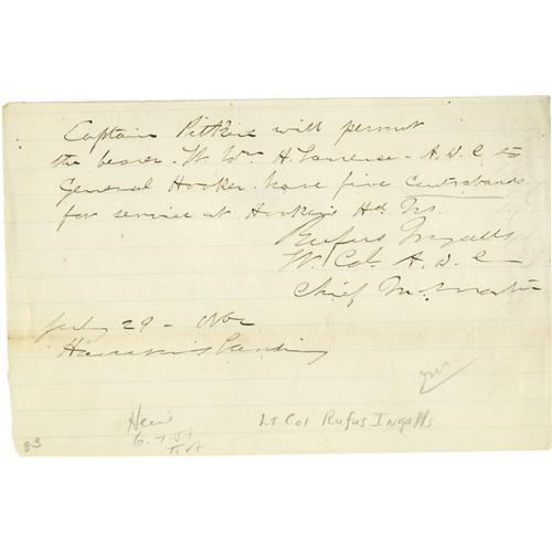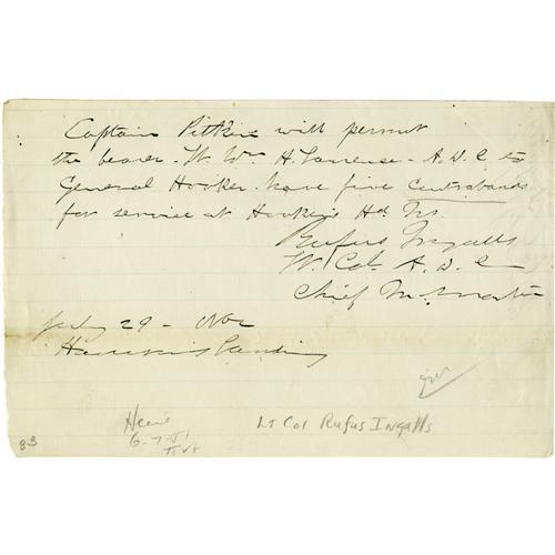 <B>Civil War Officers - A group of 23 pieces in a variety of formats including correspondence and documents signed by Civil War officers, soldiers, and others.</B></I> Includes <B>Rufus Ingalls,</B></I> A.D.S. July 29, 1862, a permit to allow General Hooker's aide, Lieutenant William H. Laurence to "<I>Have five contra bands for service at Hooker's Hd. Qrs...</B></I>"; Confederate Colonel <B>William T. Adams</B></I> A.L.S. "<I>Head Quarters Cosbys Cav. Brigade</B></I>", Oct 8, 1863 to William T. Sherman at Vicksburg "<I>Capt. W. F. Bullock A. A.A.G. visits your lines, to day, under flag of truce , as bearer of official dispatches from Brig. Genl. W. A. Jackson to your self... Requesting for him and his party the customary courtesies and privileges...</B></I>"; <B>John C. Blank</B></I> A.L.S. December 29, 1887 to "<I>Private Dalzell</B></I>" thanking the latter for his note; Private <B>John D. Ball</B></I> A.N.S. January 19, 1863 concerning a payroll matter; Lieutenant Colonel <B>C. C. Holmes</B></I> A.L.S. June 30, 1862 concerning relieving the "<I>Boston Cadets</B></I>"; Maine adjutant general <B>John L. Hodsdon</B></I> A.L.S., September 4, 1861; Major <B>Wagner Swayne</B></I> A.L.S. November 23, 1861 concerning recruitment matters and equipping the 43rd Ohio Volunteers. <I>Fold separations</B></I>; Lieutenant Colonel <B>David T. Jenkins</B></I> A.L.S. "<I>Camp on Potomac Creek Va.</B></I>" May 17, 1863 noting receipt of "<I>the Army compass...</B></I>"; Colonel <B>Charles Albright</B></I> A.L.S. July 22, 1869, to Ulysses S. Grant recommending a former subordinate in the 132nd. Pennsylvania Volunteers. <I>Laid in</B></I>; Colonel <B>Adrian R. Root</B></I> A.L.S. to General J. W. Hoffman informing the latter that the regiment has been filled to capacity; Captain <B>John Roberts</B></I> A.L.S. February 5, 1863 to a friend: "<I>...We all conde to the opinion of imbecility at Washington, and yet we are powerless toward making a reform. The advance of the French into Mexico is sufficient cause for Serious alarm-- Especially was we cannot See the end of our civil war under the policy of the present administration...</B></I>"; Major <B>R. A. Parrish</B></I> A.L.S. March 10, 1862 noting receipt of hospital stores; Captain <B>O. W. Parker</B></I> A.L.S. November 13, 1864; Colonel <B>S. S. Huard</B></I> A.L.S. April 15, 1862 explaining why "<I>Cap. D. W. Self...did not appear on the field of battle at Shiloh until the morning of the 7th...</B></I>"; Assistant Adjutant General, <B>Hemp. W. Smith</B></I> A.L.S. April 23, 1863; Captain <B>R. T. Frantz</B></I> A.L.S. August 15, 1864 concerning an enlistment; Lieutenant Colonel <B>W. B. French</B></I> A.L.S. August 31, 1863, "<I>...General Neil is in Phila. pretending sick...</B></I>"; Assistant Adjutant General <B>Fred T. Locke</B></I> A.L.S. December 20, 1863 concerning enlistments; Captain <B>J. A. McMillian</B></I> A.L.S. February 25, 1862 granting a leave of absence. More material, too voluminous to detail here. Most are in very good to fine condition. Should be viewed. <I>From the Henry E. Luhrs Collection.</B></I><BR><BR><b>Shipping:</b> Small Flat (<a target="_blank" href="http://www.heritageauctions.com/common/shipping.php">view shipping information</a>)