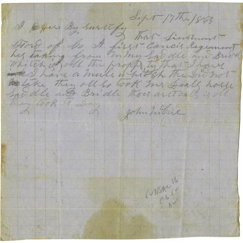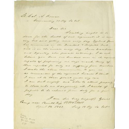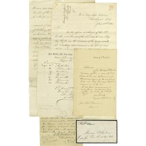 <B>Civil War - Official Correspondence</B></I> Small archive of correspondence sent in an official capacity: Including a recommendation for a Mr. George Johnston dated Dec. 24, 1861; a recommendation for promotion for a Sergeant Cook of Company C, 21st Regmt New York State Volunteers, dated Oct. 3, 1862; a receipt for a saddles, bridles taken by a lieutenant in the First Kansas Regiment, dated Sept. 17, 1863; a letter from a B.H. Littell to the Commander of the 18th Reg. LA Volunteers, stating the poor health of the regiment, including mention of typhoid fever, diarrhea and dysentery; a DS "<I>Fred J. Locke</B></I>" listing dates and places including: "<I>Sept 15 </B></I> 1863 <I> Antietam</B></I>"; a letter from Chaplain C.W. Jackson, Armory Square Hospital, July 14, 1864, informing Joseph Sanborn of the death of his son as a result of diarrhea; an LS by LaRue P. Adams recommending Edward Ringold for a medal of honor for gallantry and detailing his heroic acts. Overall condition of all documents is good to very good.<BR><BR><b>Shipping:</b> Small Flat (<a target="_blank" href="http://www.heritageauctions.com/common/shipping.php">view shipping information</a>)