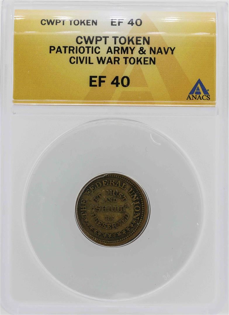 One Civil War Patriotic Army & Navy Token ANACS XF40. ANACS Appraised.