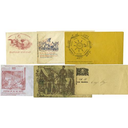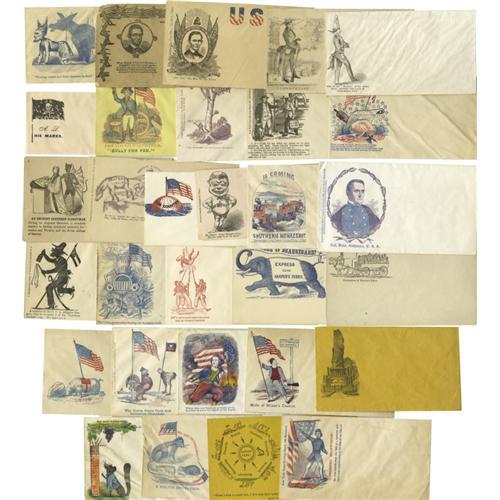 <B>Civil War Patriotic Covers</B></I> A fine set of thirty-four (34) Union patriotic covers, many printed in color on various subjects, including many good lampoons on the Confederacy and Jefferson Davis. Numerous faults including cockling, mounting remnants on verso, a few marginal tears, dampstains, light toning, and occasional foxing.<BR><BR><b>Shipping:</b> Flat Material, Small (<a target="_blank" href="http://www.heritageauctions.com/common/shipping.php">view shipping information</a>) <BR><BR><B>Important notic