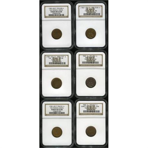 <B>Civil War Patriotic Group.</B></I> Consists of: an <B>(1861-65) The Federal Union, Fuld-223/328A, R.2, MS64 Red and Brown NGC; (1861-65) The Federal Union, Fuld-225A/327A, R.3, MS65 NGC; The Federal Union, Fuld-226/321A, R.4, AU53 NGC; (1861-65) Our Country, Fuld-230/325B, R.2, MS64 Red and Brown NGC; (1861-65) Our Country, Fuld-231/352A, R.1, MS65 Brown;</B></I> and an <B>1863 Constitution For Ever, Fuld-243/247A, R.3, MS63 Brown NGC,</B></I> with the German words ERINNERUNG AN meaning "remembrance of" or "in memory of" and the date 1863 on the reverse. Catalog value should be about $200-$250 for these higher-grade pieces compared to the catalog.<BR><BR><b>Shipping:</b> Coins & Currency (<a target="_blank" href="http://www.heritageauctions.com/common/shipping.php">view shipping information</a>)