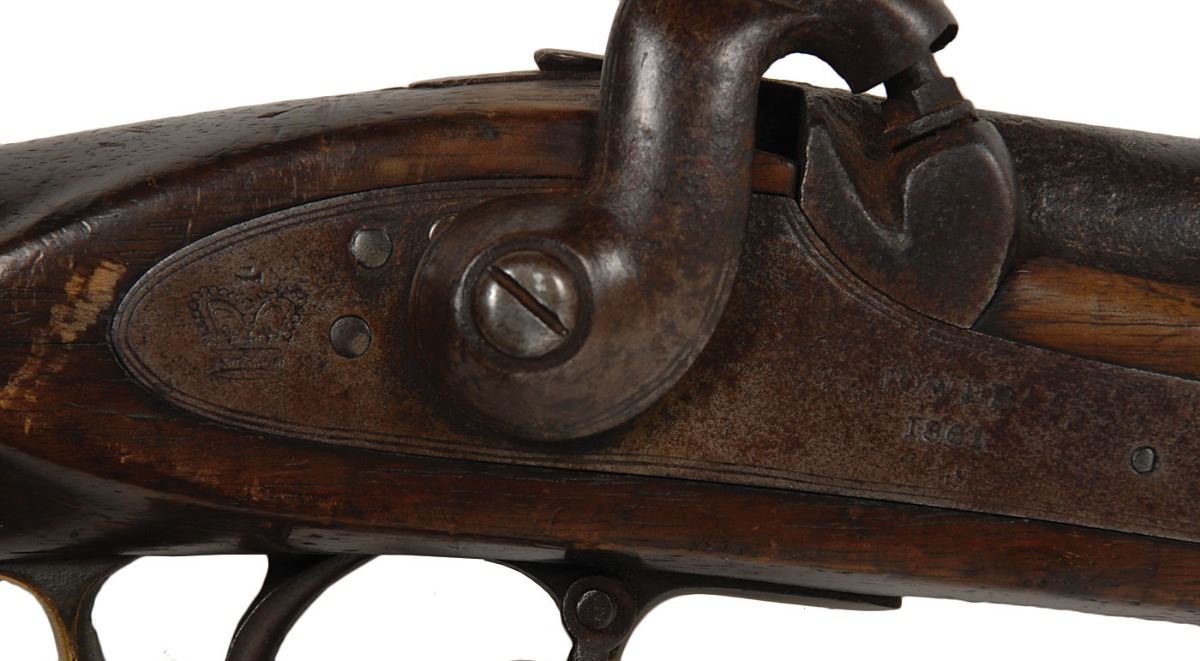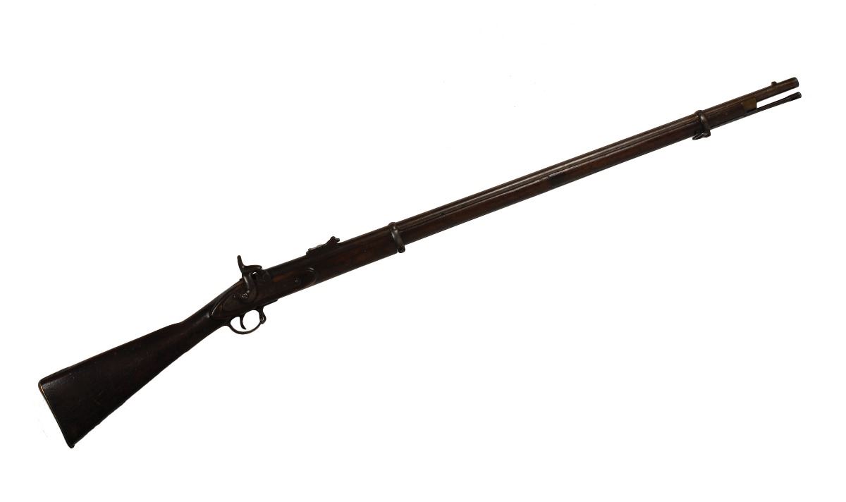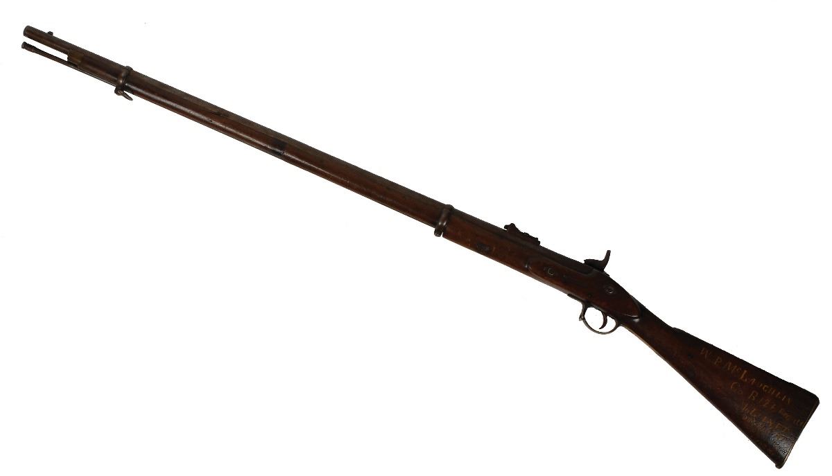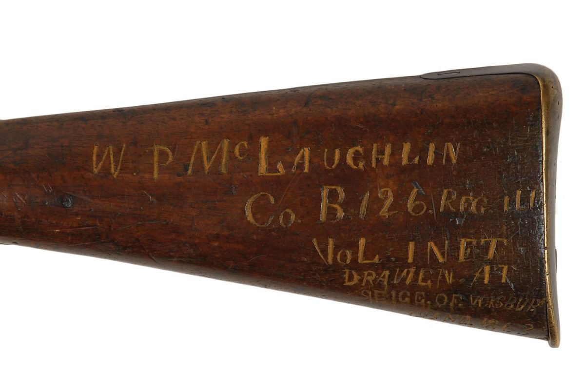 Civil War Pattern 1853 Enfield Rifle-Musket identified to Pvt. William P. McLaughlin of the 126th Illinois Infantry, approximately .59 caliber, 39? smoothbore barrel with a dark, moderately freckled bore. This is a Tower marked, 1861 dated Enfield that has been altered to smoothbore and has an overall freckled brown patina on the metal. The breech-end of the barrel and the lock have areas of light-moderate pitting, and the hammer nose has a small chip missing. The walnut stock has an old varnish finish throughout with numerous handling marks and blemishes present throughout, including a large chip on the left side just behind the lower band, and a small oblong area where a small plate or plaque used to be inset. There is a stable with-the-grain crack running forward from the rear lock screw bolster, the original ramrod is still present, and the middle band is missing. The left side of the butt is extensively carved: “W. P. McLaughlin, Co. B 126. Reg. Ill., Vol. Inft., Drawen at Seige of Vicksbur[g], June 1863.”