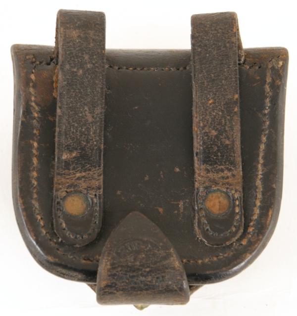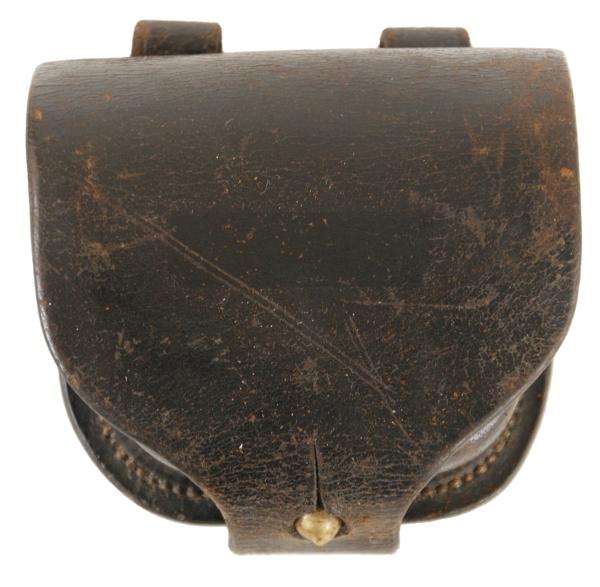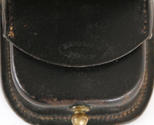 Civil War Percussion Cap Box. Black leather is in excellent condition. The inside flap is marked (in an oval) H.G Haedrich over Philada.