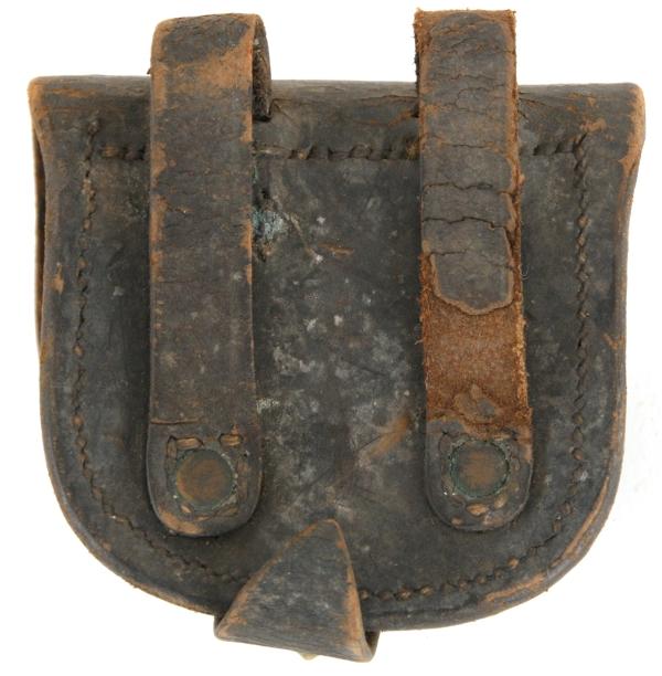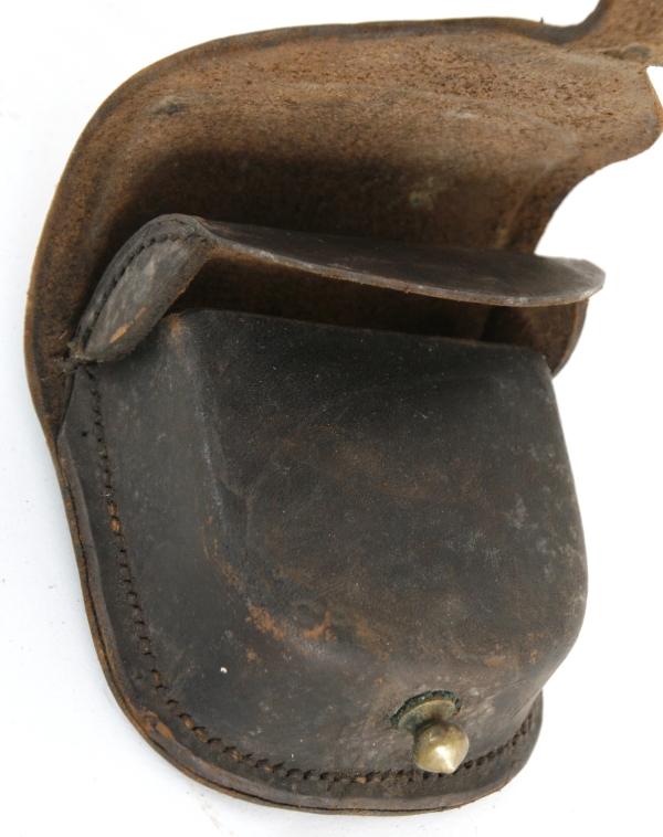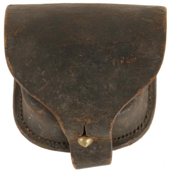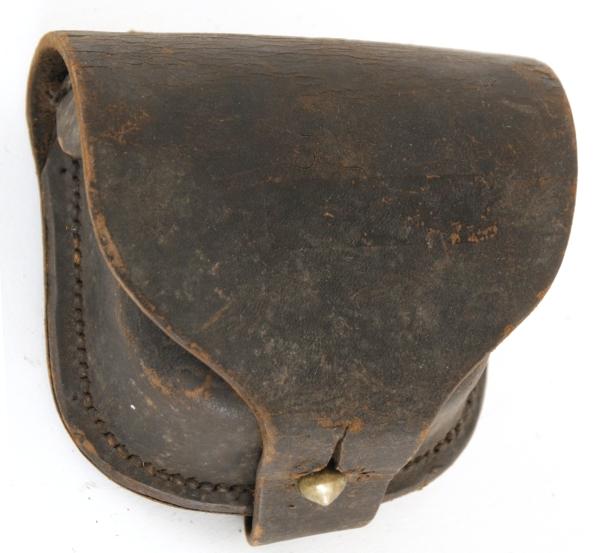 Civil War Percussion Cap Box. Black leather is in good condition and there are no markings on the box.