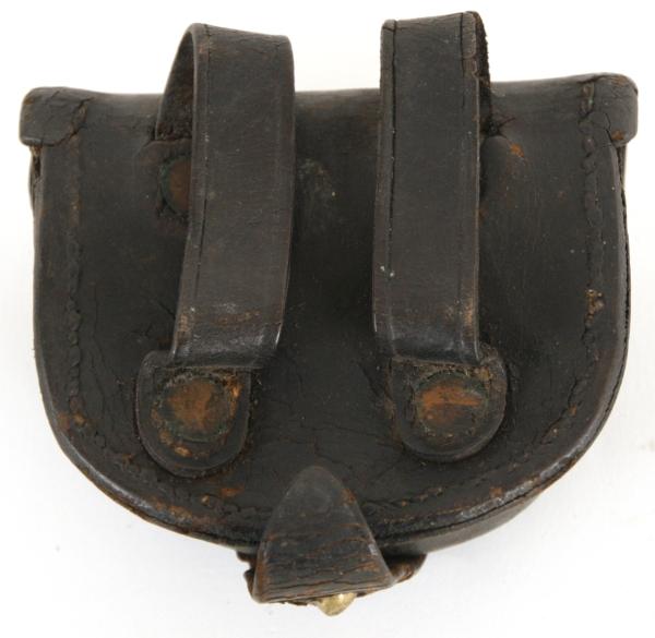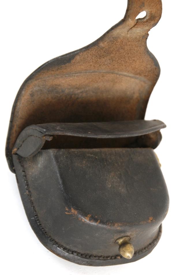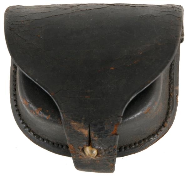 Civil War Percussion Cap Box. Black leather box is in very good condition. The interior flap is marked E. Gaylord, Chicopee, Mass. in three lines. The front locking strap is losing a little bit of finish. A nice example.