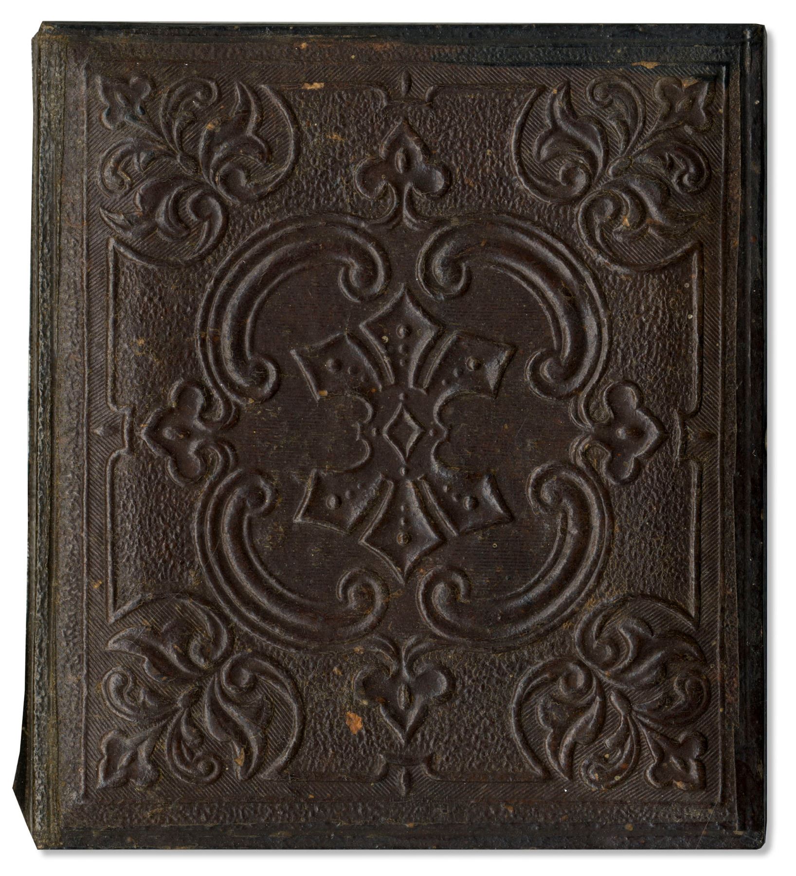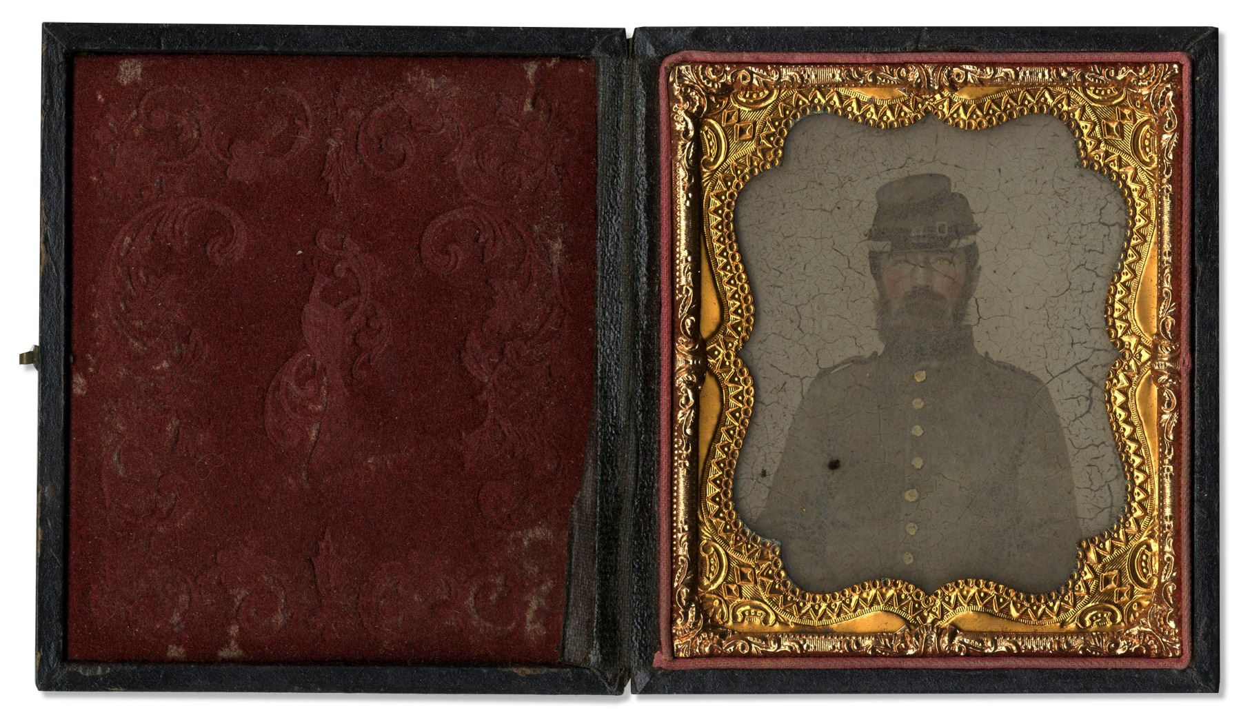Quarter-plate tintype civil war photo of Union soldier, in full beard, photographed from the waist up with gilt to buttons and kepi insignia. Housed in full case with repair to spine. Image has some wear, with crackling on surface.