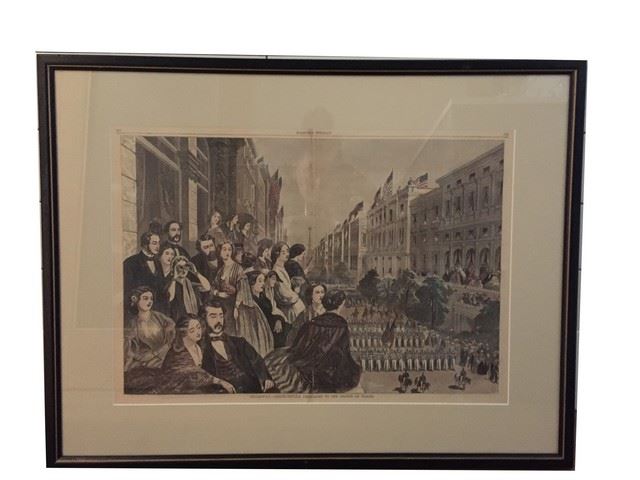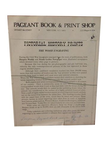 A pictorial history print: "The Wood Engraving". During the Civil War, 2 Giants emerged from the mass of publications. Both Harper's Weekly and Frank Leslie's Newspaper were illustrated newspapers which devoted every other page to pictures. Because this was during the pre photographic and pre half tone era, virtually the only contemporaneos pictures of the war appeared in these eagerly awaited papers. Although their combined circulation reached less than 200,000, many more than that number of readers saw the war pictures as they were passed quickly from hand to hand until most were only tattered remnants. When the war ended, both publishers turned their attention to depicting the newly expanding United States and especially the recently settled west. Both papers sent artist correspondence often on horseback to all corners of our country. Once a newsworthy scene or view was encountered, the correspondent would draw it just as they had, while with the troops during the war. The artwork would then be rushed to the publishing house where the artwork was transferred to the surface of a highly polished boxwood plate. Next a staff of highly skilled workers known as wood engravers would carefully cut out the wood from between the artists lines. The resulting wooden block with the raised lines of the artist would then be inked and printed. These pictures known as wood engravings were often done by some of America's most famous artists such as Winslow Homer, Frederick Remington, A. B. Frost and Thomas Nast. Today they are valued both by art collectors and historians. While some are expensive and "Homer's" "Snap the whip" a double page Harper's retails at up to $4,000. Most are still obtainable in the $10-$100 range. Today collectors and collecting institutions alike often prefer the wood engravings to be water colored to enhance their appeal and decor value. Purchased in 1995 on Houston Street from the Pageant Book and Print Shop for $80. Framed in glass.