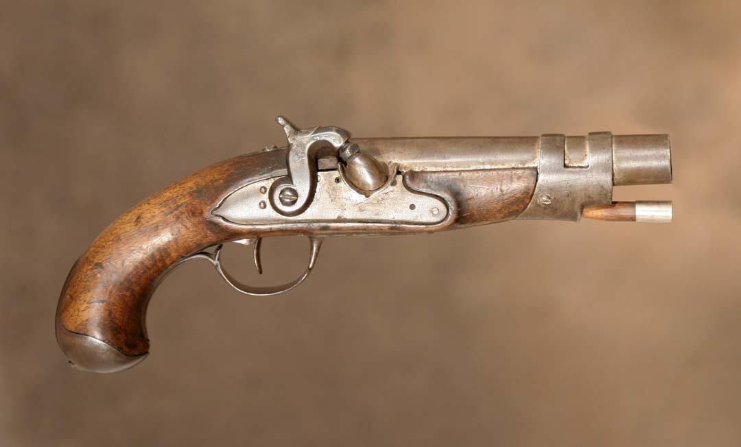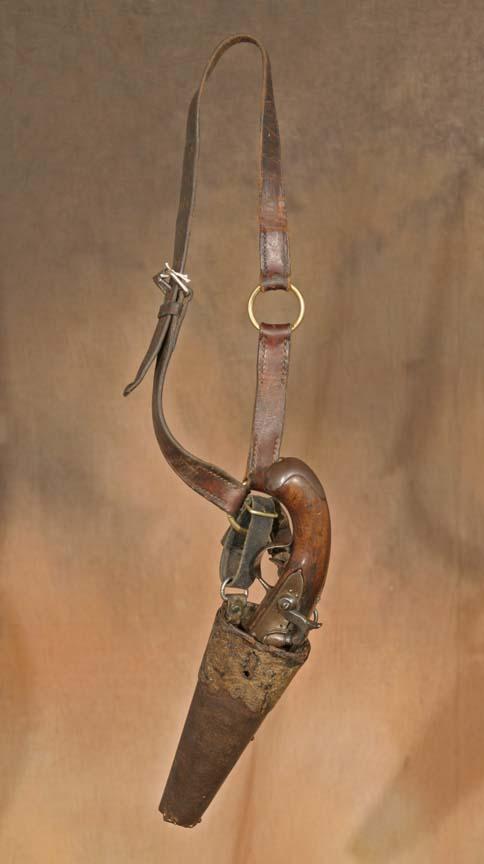 Civil War Pistol In Gun Rig. 5 ¾" barrel, 11" overall. Confederate altered from flintlock to percussion, functions nicely. Marked under barrel with name & proof mark. With a wonderful primitive belt & holster. (est $2,000-3,000). For condition reports please visit: www.auctioninsantafe.com/cr2011.pdf