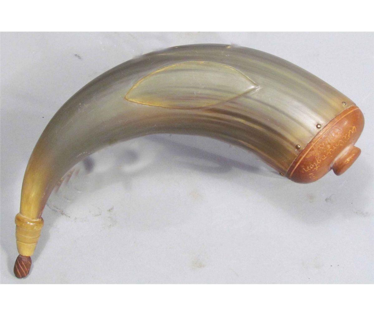 Civil War Powder Horn Carved by Fred Benlehr. Civil War Veteran 1809-1889. Brass brads around top. Carved tip with carved wood stoppers on both ends, Fred's signature and hometown on end. Excellent original condition. 11 1/2 inches long.