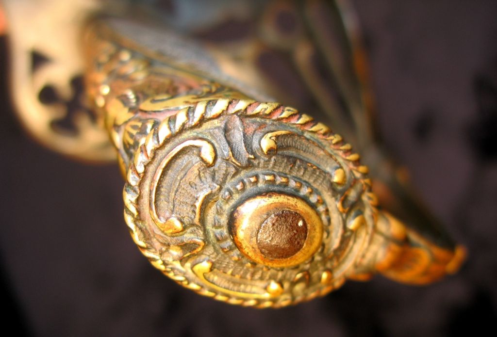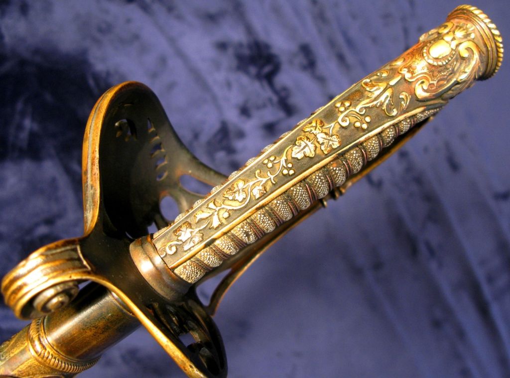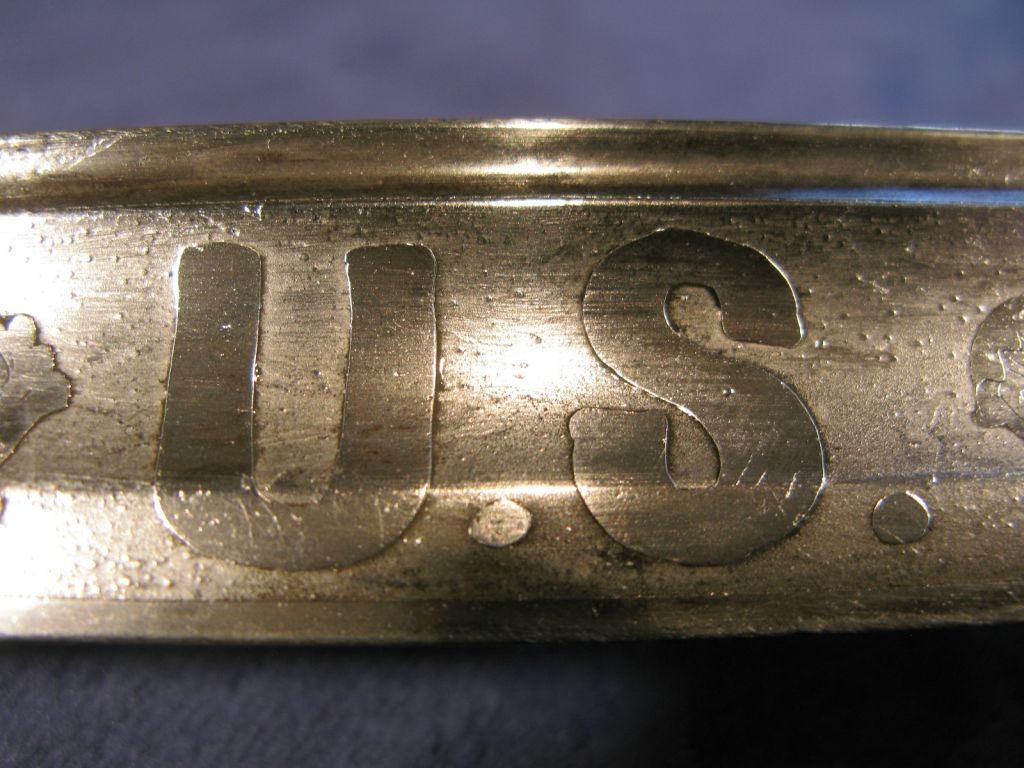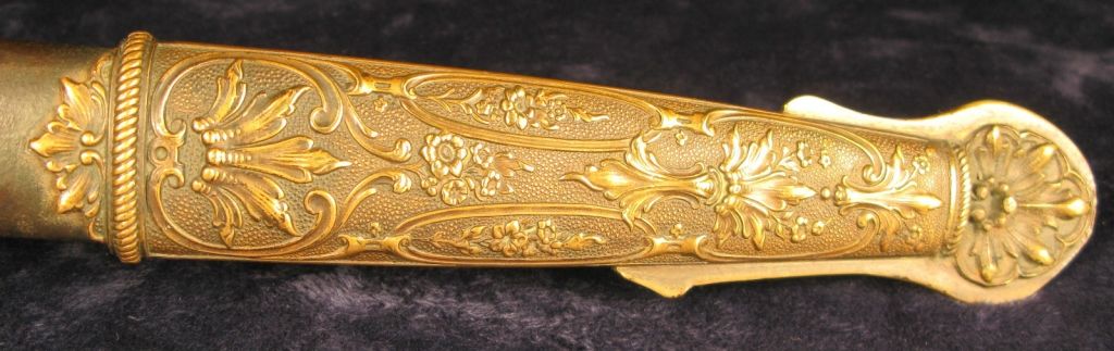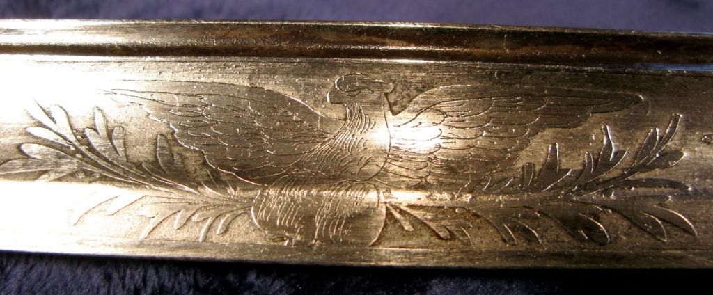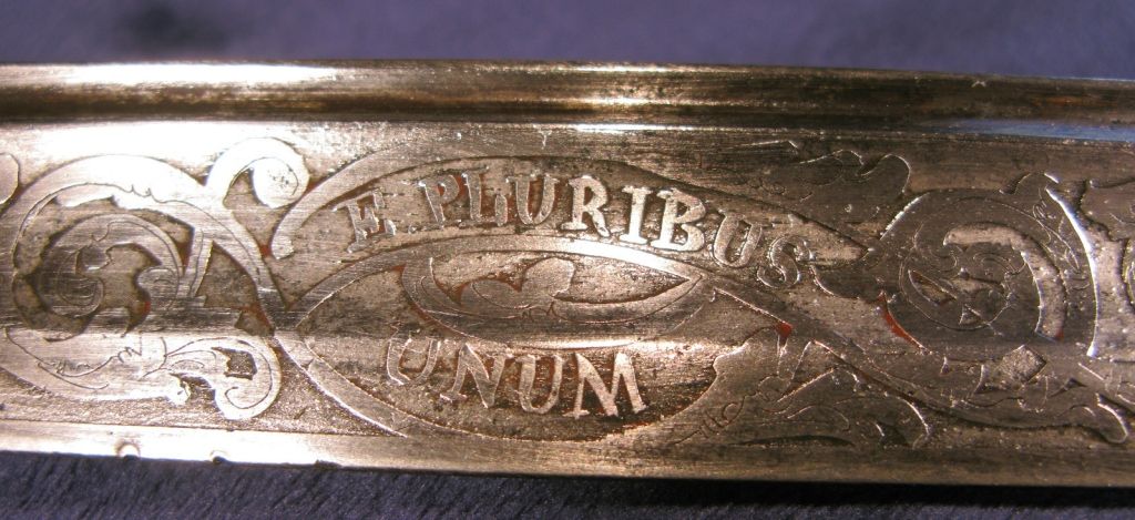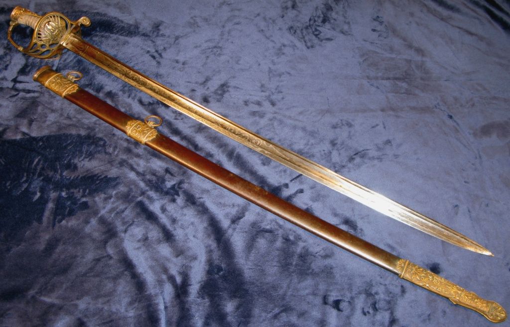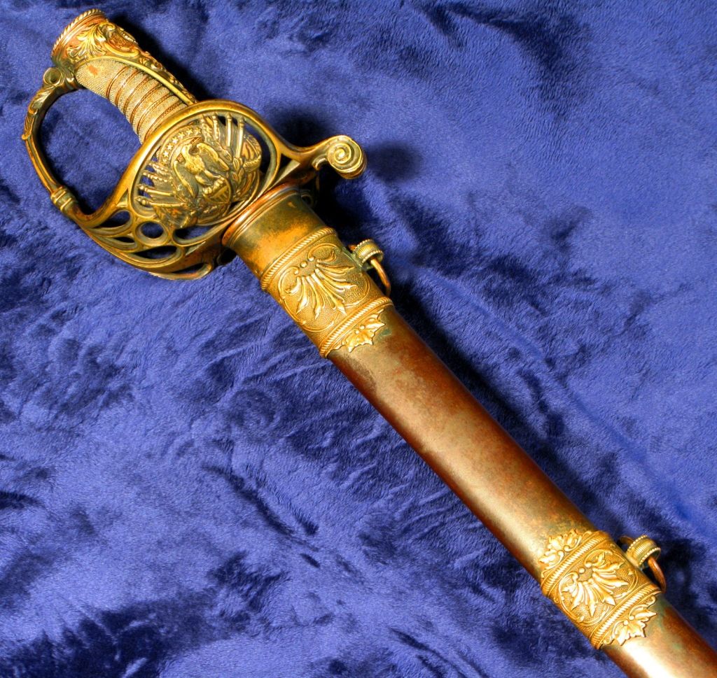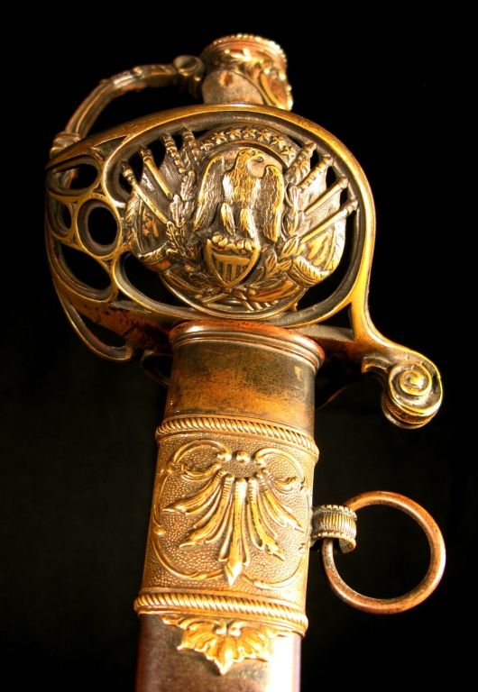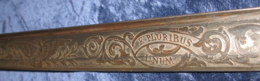 Civil War Presentation Staff & Field Officer Sword, The Klingenthal blade displays a deeply etched patriotic eagle, the motto " E Pluribus Unum" within ribbon, a "US", penelope of arms, and other floral designs. The base of the blade has two poincons; one is a "B" under a crown and the second is a "S" within a shield. The French pattern brass guard depicts an eagle on shield under seven stars with "E.L" punched on the forward face under a well defined quillion. The pommel and backstrap are elaborately cast in "rococo" styled decoration. The scabbard has beautiful matching relief cast brass mounts. Grip is sharkskin; some honest wear, but almost complete as seen in pictures. Triple wire rapping complete. Blade: A little over 32" Overall length: 39"