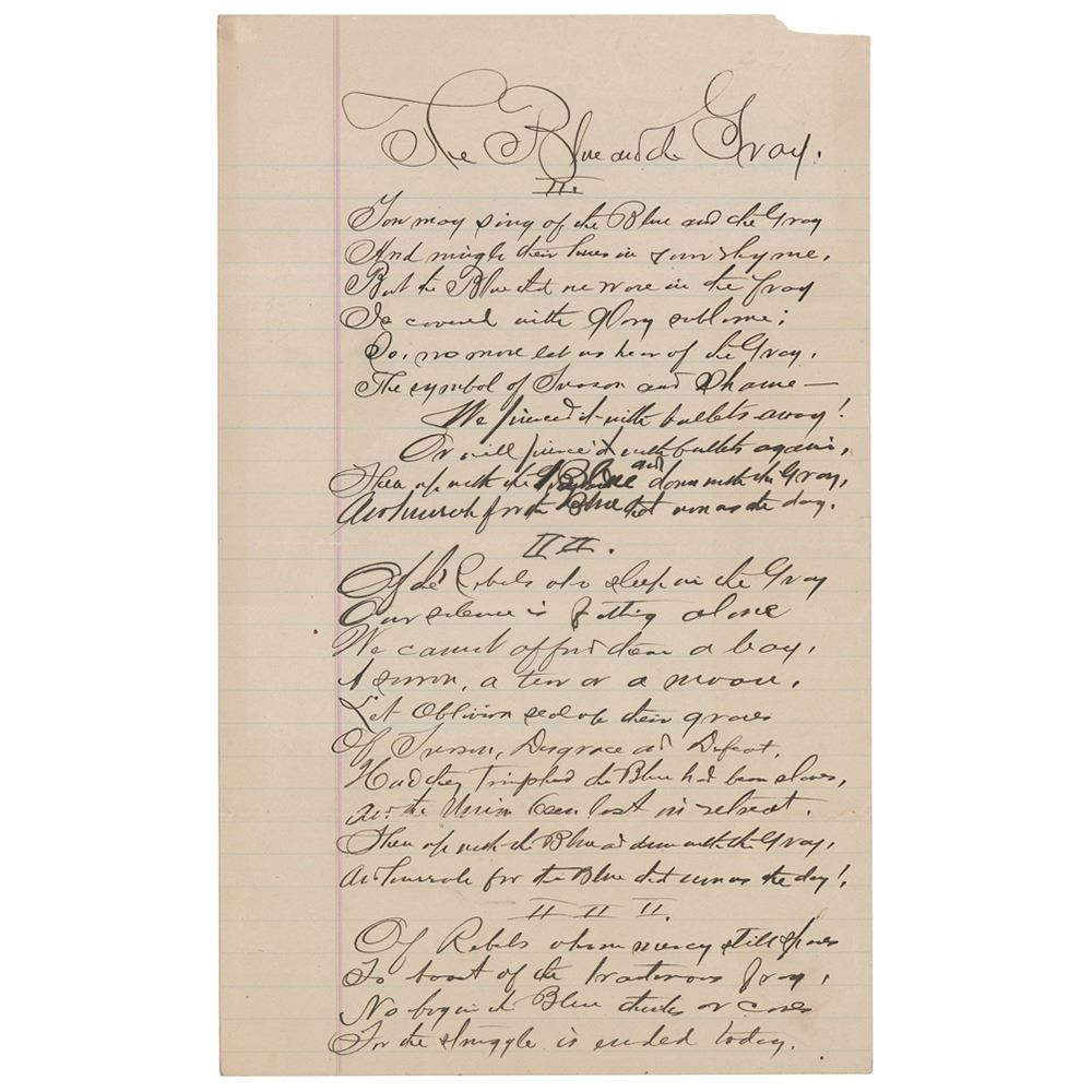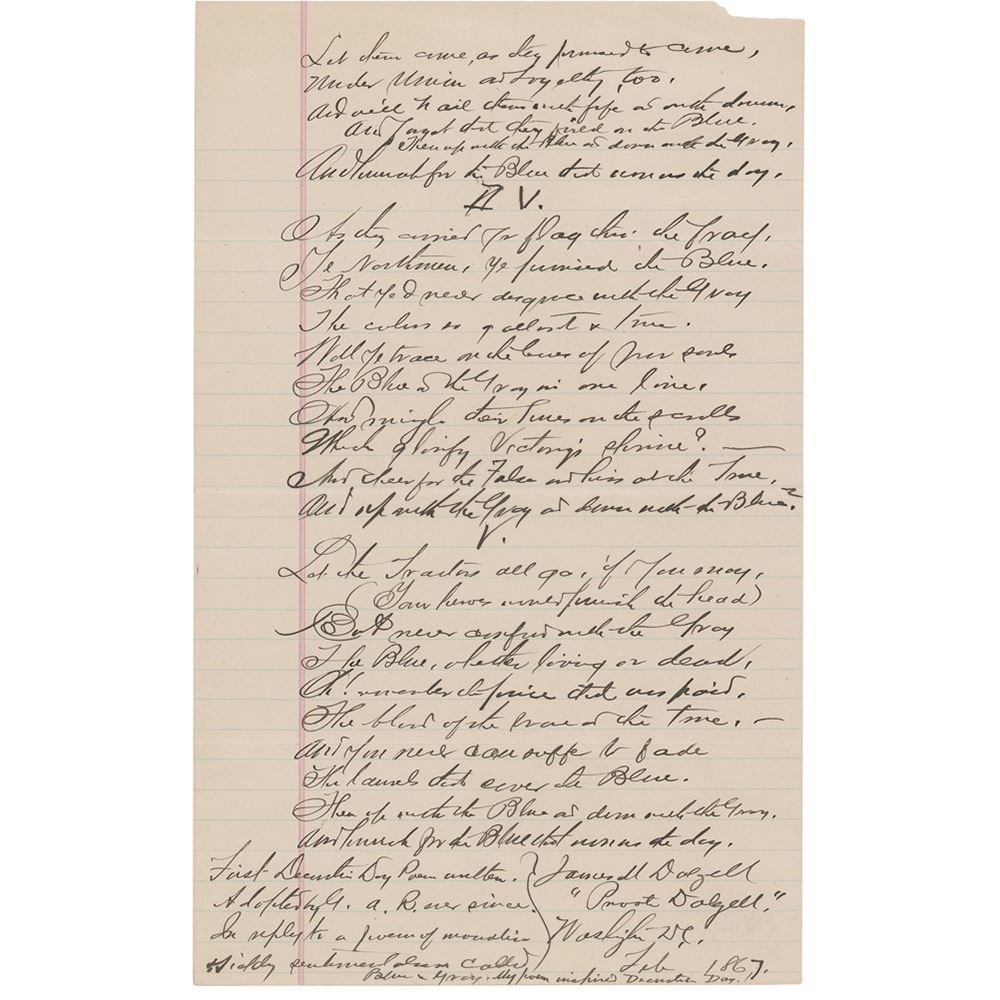 Autograph manuscript signed "James M. Dalzell, 'Private Dalzell,'" two pages, 7.75 x 12.5, headed: "The Blue and the Gray." Dalzell pens his five-stanza revision of Francis Miles Finch’s famous 1867 poem, beginning: "You may sing of the Blue and the Gray / And mingle their Lines in your rhyme, / But the Blue that we wore in the fray / Is covered with glory sublime: / So no more let us hear of the Gray, / The symbol of Treason and Shame— / We pierced it with bullets, away!" In fine condition, with minor loss to the upper right corner.