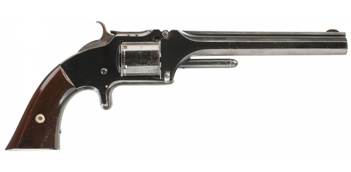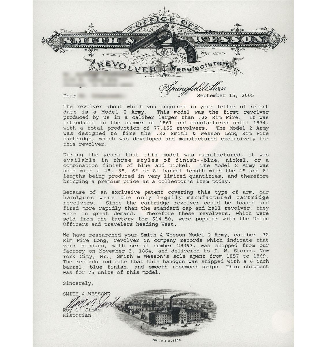 The accompanying factory letter verifies the 6 inch barrel length, blue finish, smooth rosewood grips and that it was shipped as 1 of 75 to J.W. Storrs, New York, N.Y. on November 3, 1864.