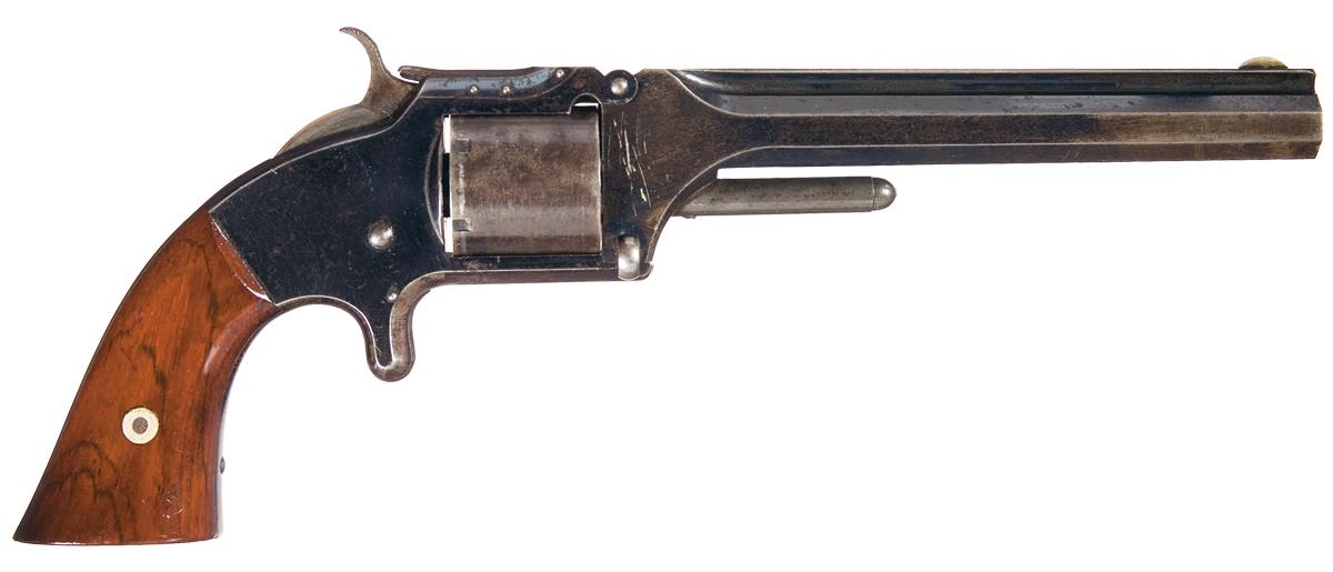 This model was manufactured between 1861 and 1874, this revolver was very successful commercially. Many of these were used as personal side arms by Civil War soldiers. The top of the barrel rib is marked "SMITH & WESSON SPRINGFIELD, MASS.". The serial number is marked on the butt. German silver blade fixed front sight, 6-shot, unfluted cylinder is roll engraved with the S&W 1855, 1859 and 1860 patent dates around the center. The frame has a spur trigger and three-pin top strap. Fitted with smooth two piece rosewood grips.
