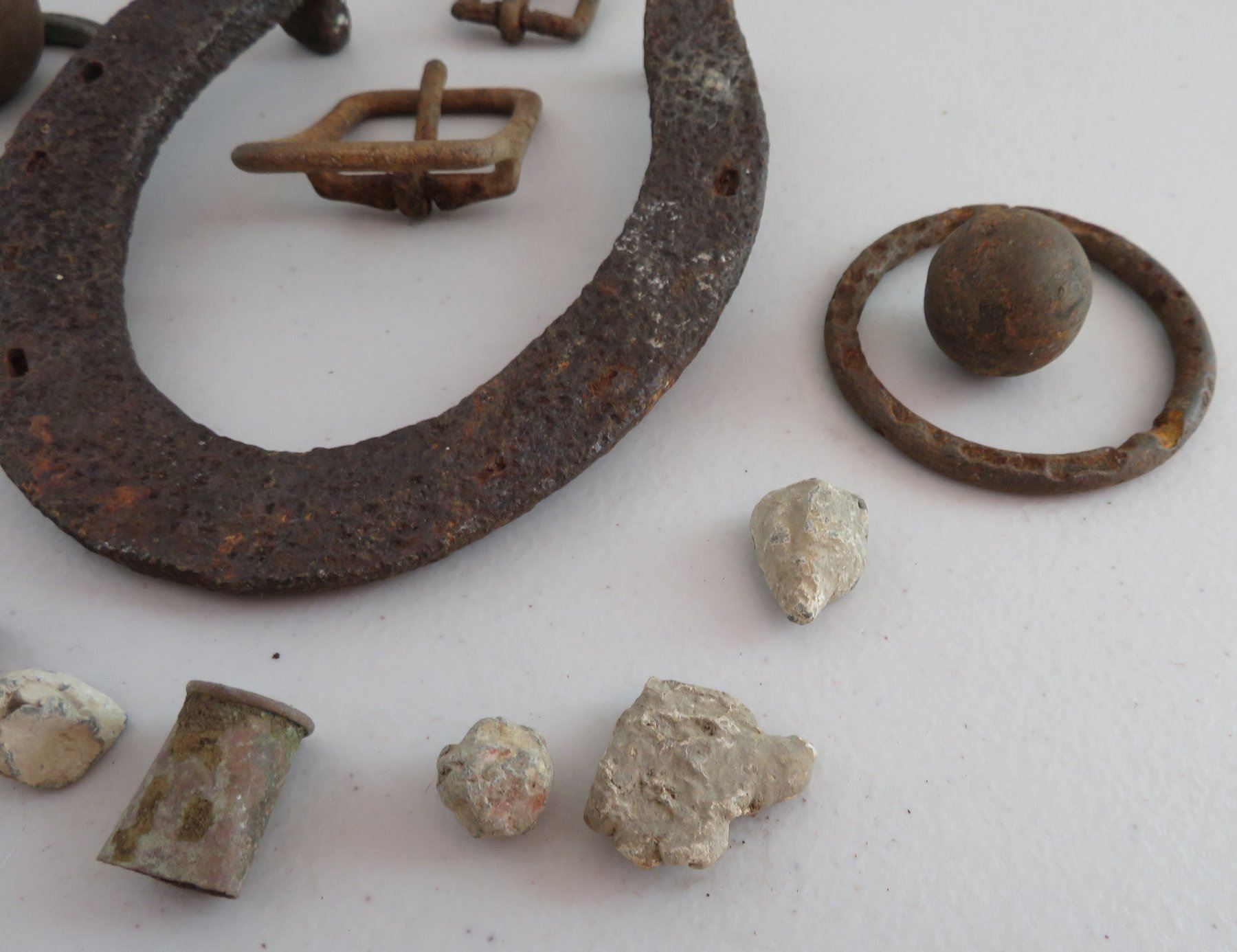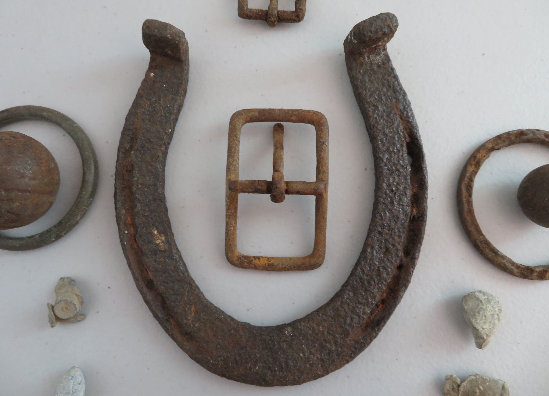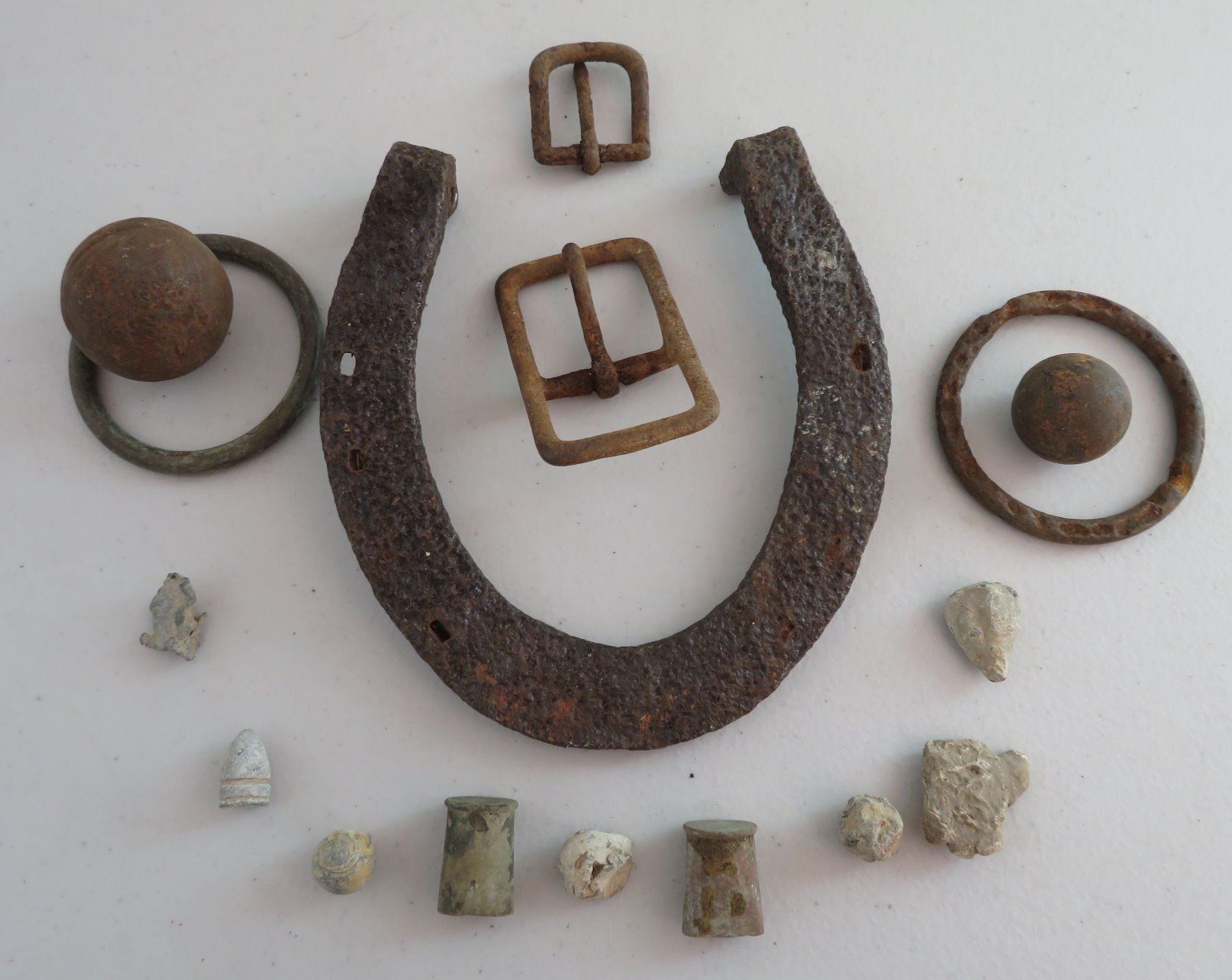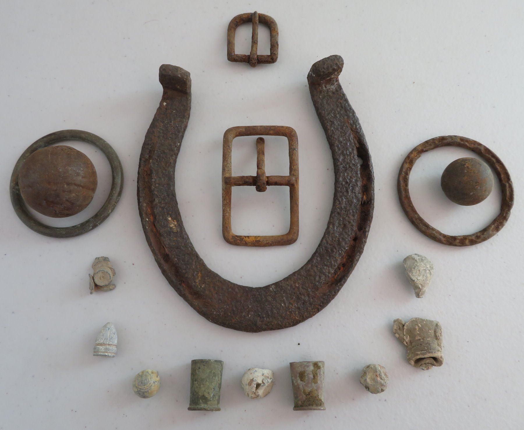 Civil War Relics, c. 1860s. Made of steel, iron and other alloys, the horseshoe measures 6" x 5 1/4". Kentucky. Found on private land in the Midwest. Horseshoe, spent ammo, buckles, etc. Condition: Good, heavy patina, see images. Shipping: $18.50 w/insurance and signature.