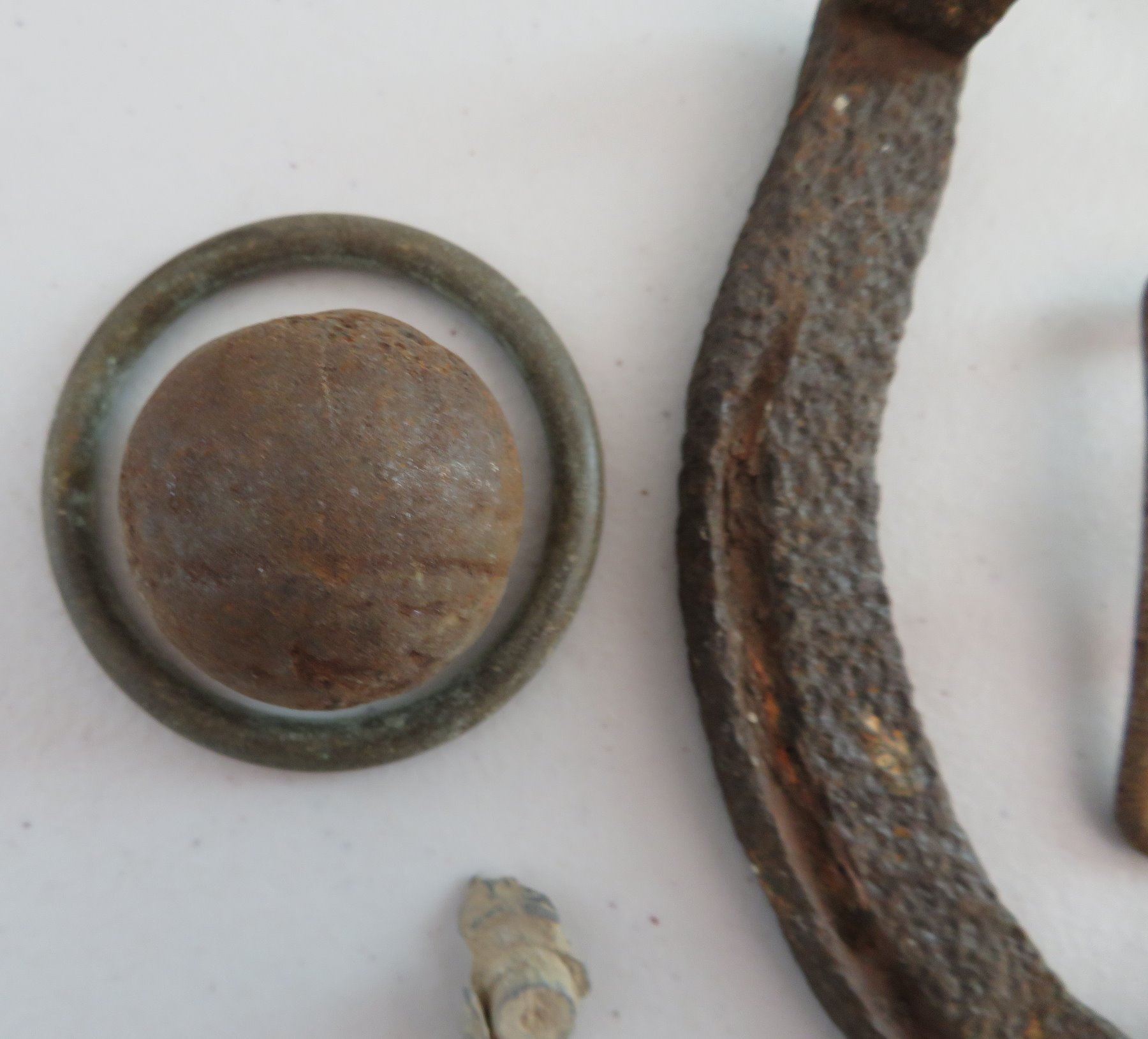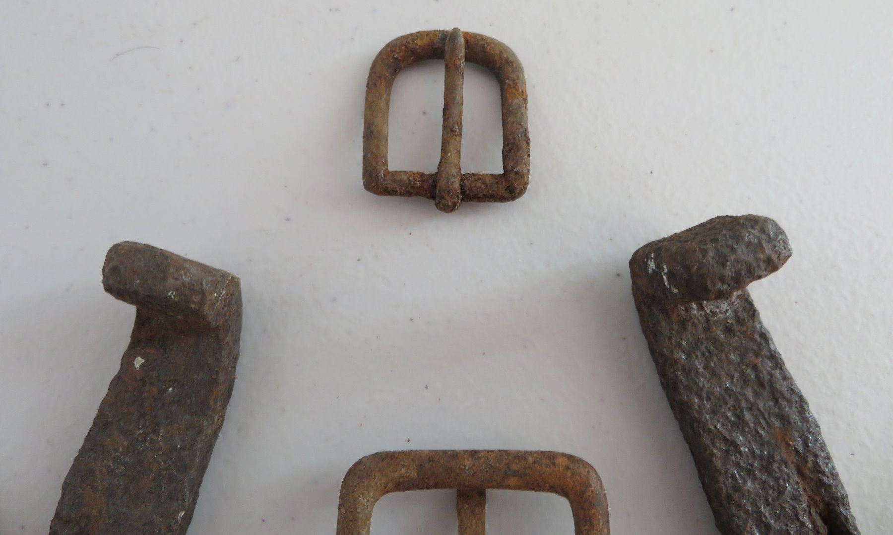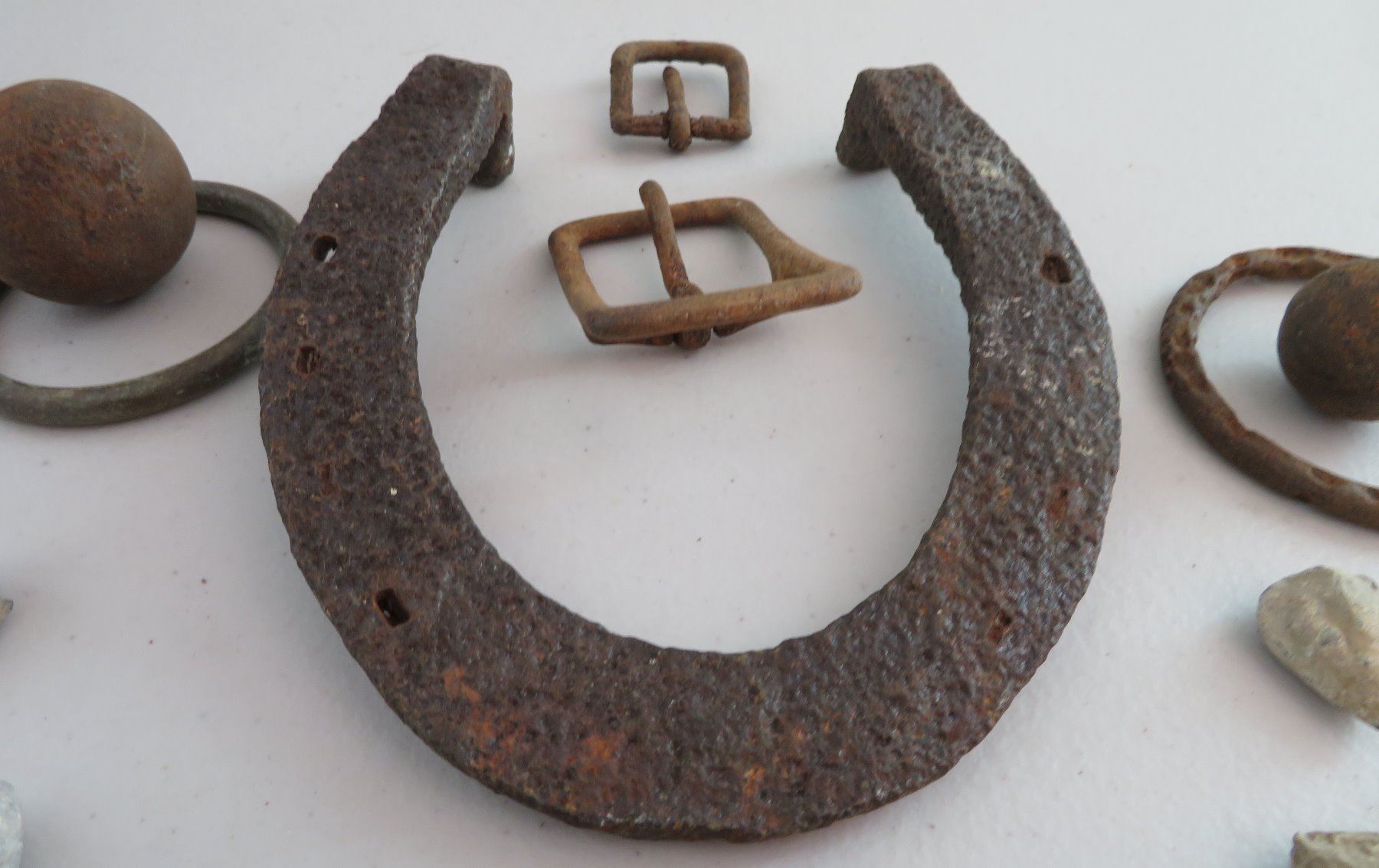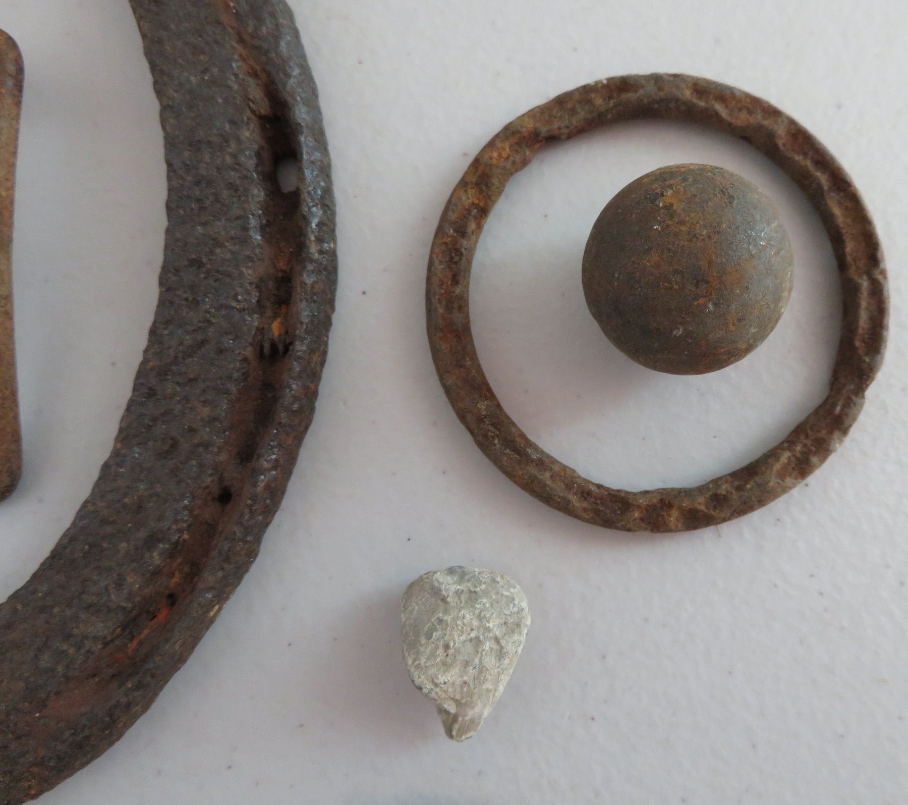 Civil War Relics, c. 1860s. Made of steel, iron and other alloys, the horseshoe measures 6" x 5 1/4". Kentucky. Found on private land in the Midwest. Horseshoe, spent ammo, buckles, etc. Condition: Good, heavy patina, see images. Shipping: $18.50 w/insurance and signature.