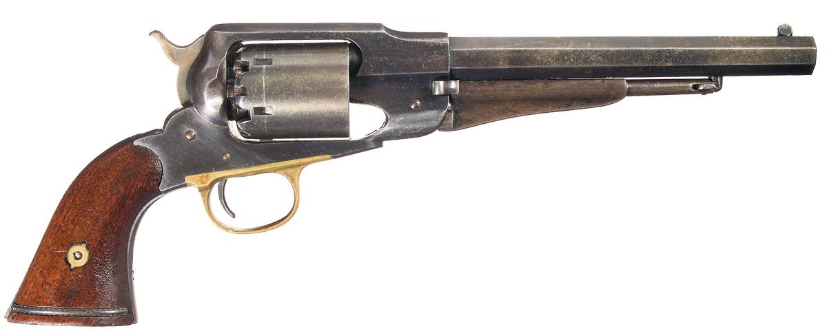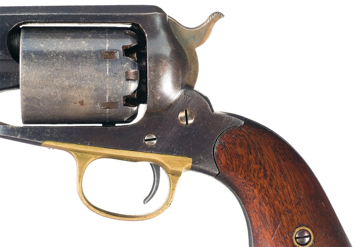 Manufactured from 1863-1875. Fixed pinched blade front sight and notched rear sight. The top barrel flat is marked "PATENTED SEPT. 14. 1858 / E. REMINGTON & SONS. ILION NEW YORK. U.S.A / NEW-MODEL". Brass trigger guard. Single letter inspection marks (W, R, G and D) are stamped on most of the components. Matching serial number on the barrel and on the frame under the left grip and "143" is marked on the back of each grip panel. Smooth period customized walnut grips with a decorative silver bar inset at the bottom of each panel.