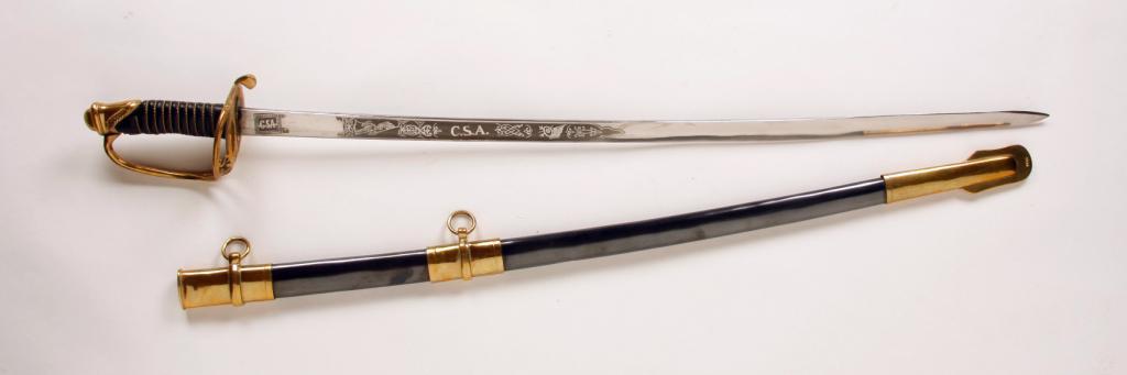 Civil War Reproduction Sword From CSA Made in India. Frosted nickel finish blade marked C.S.A. Black scabbard with brass fittings, wire wrapped black leather grip, brass guard. Great for Civil War re-enactment.