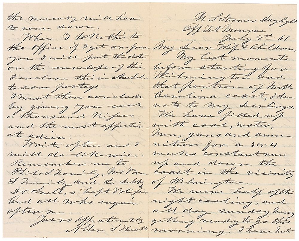 Civil War surgeon Allen S. Heath (b. 1821). Surgeon on the staffs of General King in West Virginia and of General Michael Corcoran's Irish Legion in Georgia. Two war-dated ALSs, each signed “Allen S. Heath,” lightly-lined, 5 x 8, each four sides on two adjoining pages, US Steamer Daylight off Fortress Monroe, both dated July 8, 1861. In separate letters to his brother, and to his wife and children before the USS Daylight undertakes a foray down the coast to North Carolina in search of enemy shipping and Confederates. To his brother, he writes: "We have got every nook and corner filled with coal & water, have taken on an extra sailing master, a rifled gun & numerous other things, and am off for Wilmington North Carolina after prizes and privateers. I do not think we will be gone more than 3 or 4 weeks…l regret not having an opportunity to see and participate in the big fight, but our present enterprize will be much more remunerative.” The second letter to his family reads, in part: “My last moments before starting for Wilmington and that portion of North Carolina coast…We have filled up with coal, water, men, guns and ammunition for a 3 or 4 weeks constant run up and down the coast in the vicinity of Wilmington…lf you can spare money enough to get a barrel of flour you had better.” In overall fine condition.