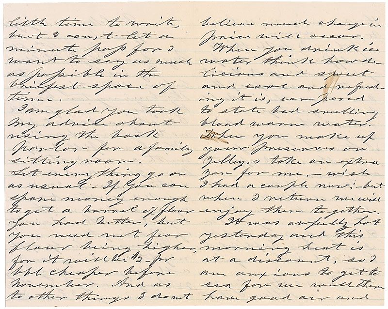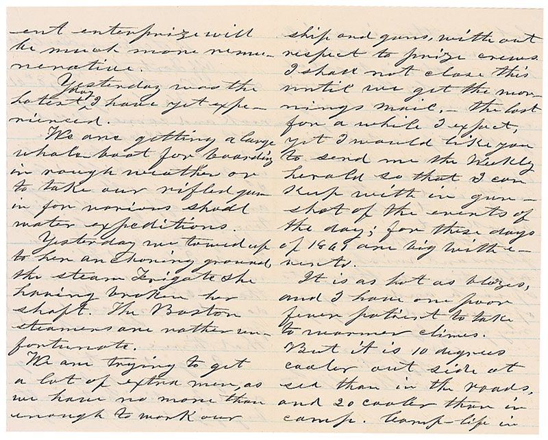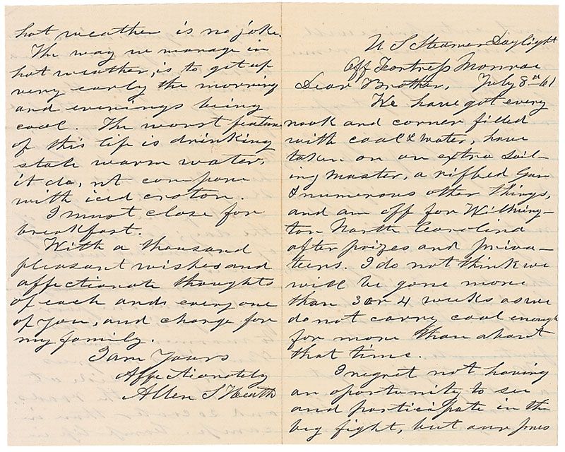 Civil War surgeon Allen S. Heath (b. 1821). Surgeon on the staffs of General King in West Virginia and of General Michael Corcoran's Irish Legion in Georgia. Two war-dated ALSs, each signed “Allen S. Heath,” lightly-lined, 5 x 8, each four sides on two adjoining pages, US Steamer Daylight off Fortress Monroe, both dated July 8, 1861. In separate letters to his brother, and to his wife and children before the USS Daylight undertakes a foray down the coast to North Carolina in search of enemy shipping and Confederates. To his brother, he writes: "We have got every nook and corner filled with coal & water, have taken on an extra sailing master, a rifled gun & numerous other things, and am off for Wilmington North Carolina after prizes and privateers. I do not think we will be gone more than 3 or 4 weeks…l regret not having an opportunity to see and participate in the big fight, but our present enterprize will be much more remunerative.” The second letter to his family reads, in part: “My last moments before starting for Wilmington and that portion of North Carolina coast…We have filled up with coal, water, men, guns and ammunition for a 3 or 4 weeks constant run up and down the coast in the vicinity of Wilmington…lf you can spare money enough to get a barrel of flour you had better.” In overall fine condition.