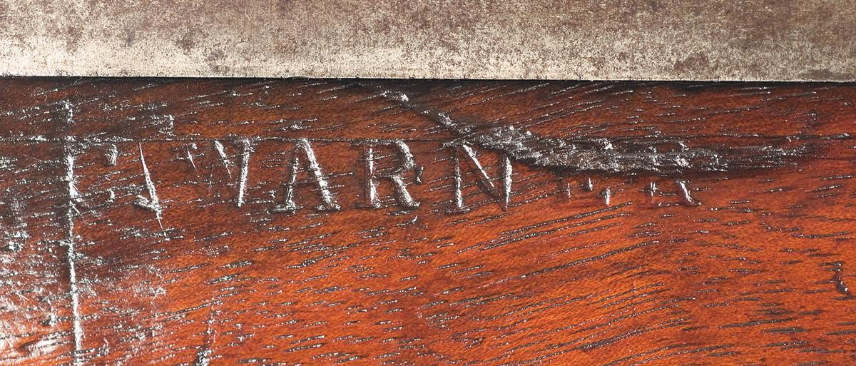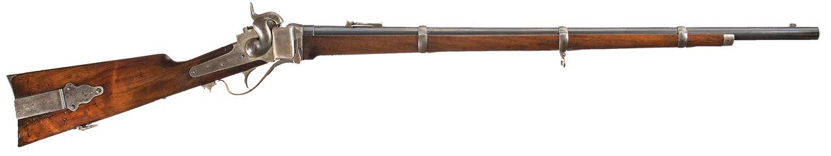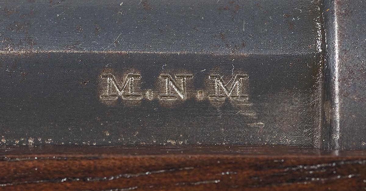 Lawrence patent rear sight and block front sight with blade. The top of the barrel in front of the rear sight is marked "SHARP'S RIFLE / MANUFG. CO. / HARTFORD CONN" and "NEW MODEL 1863" behind the sight. The left side of the barrel just ahead of the breech is stamped "M.N.M.". The lock is marked above the hammer "R.S. LAWRENCE PAT. / APRIL 12th 1859", behind the hammer "C. SHARPS PAT. / OCT. 8th 1858" and on the left side of the receiver "C.SHARPS PAT. / SEPT. 12th 1848" marking. The lower tang is marked with an "M" ahead of the trigger and "G" at the other end, and "G" on the lever. Blue barrel and casehardened receiver, lever and hammer. Mounted with a plain forearm with a metal forend cap and three barrel bands, sling swivel on the second barrel band, and straight grip stock with patch box, steel buttplate and sling swivel. "C. Warner" is branded/stamped on right side of buttstock below patch box. The buttplate tang is stamped with a small "R" and the top of the stock ahead of the tang is stamped "M.N.M.". Each barrel band is stamped with the letter "M".