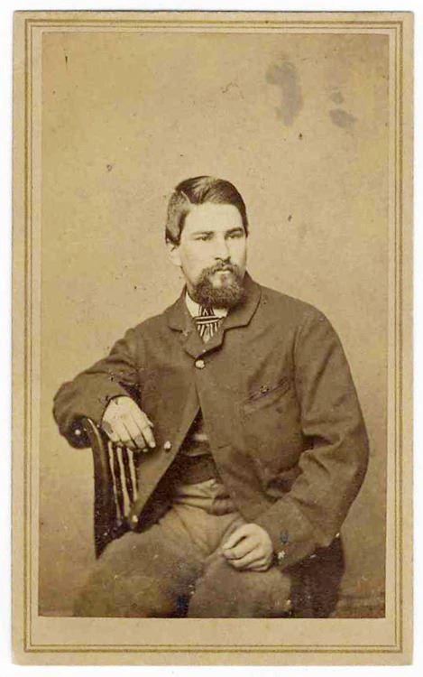 CW CDV of Lexington, KY. Soldier wears military jacket with buttons and military-style tie. The dark-haired, bearded soldier sits posed with one hand on chair back, one hand on lap, and a pensive expression on his face. Some spots mark the background field top right. Photographer: Carpenter & Mullen Magnolia Gallery. Signed on back ''Chas. W. Nufenger.'' U.S. revenue stamp on back of photo. Good condition.