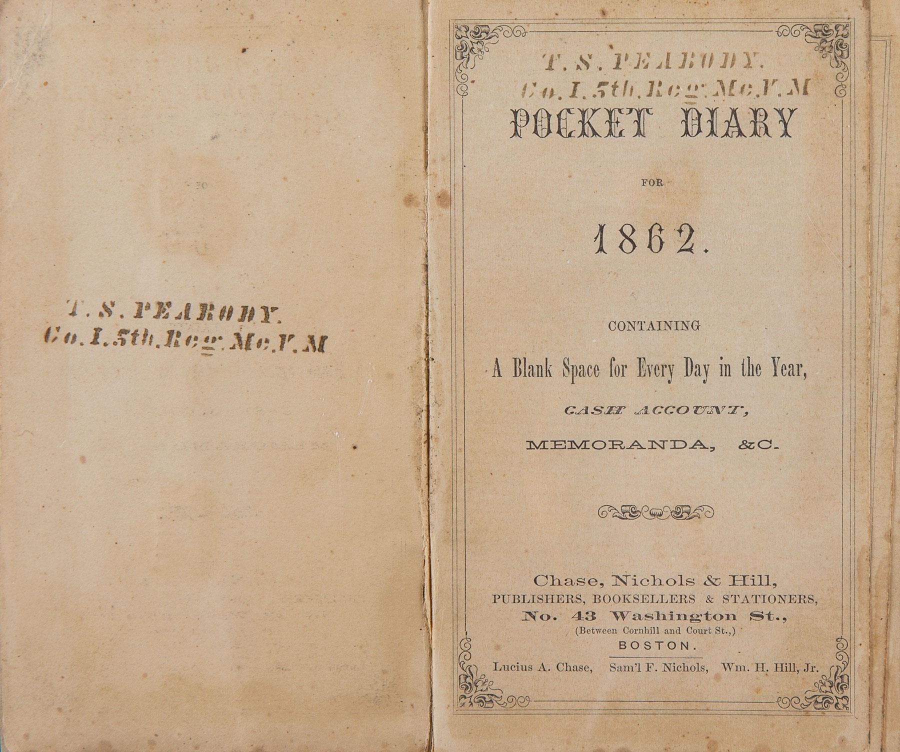 Personal pocket diary for 1862 of "T. S. Peabody, Co. I, 5th Reg. Me. V. M.," stamped with his name on the title page, 3.25 x 5, filled with daily entries (in ink and pencil) for the entire year, chronicling his service. On New Year's Day, he notes: "The parting of the old year & the welcomming of the new year was celebrated by firing guns beating drums playing on bugles bands &c, we have our dress parade at 4 o'clock." He records observations of camp life, guard and picket duties, drills, and dress parades.