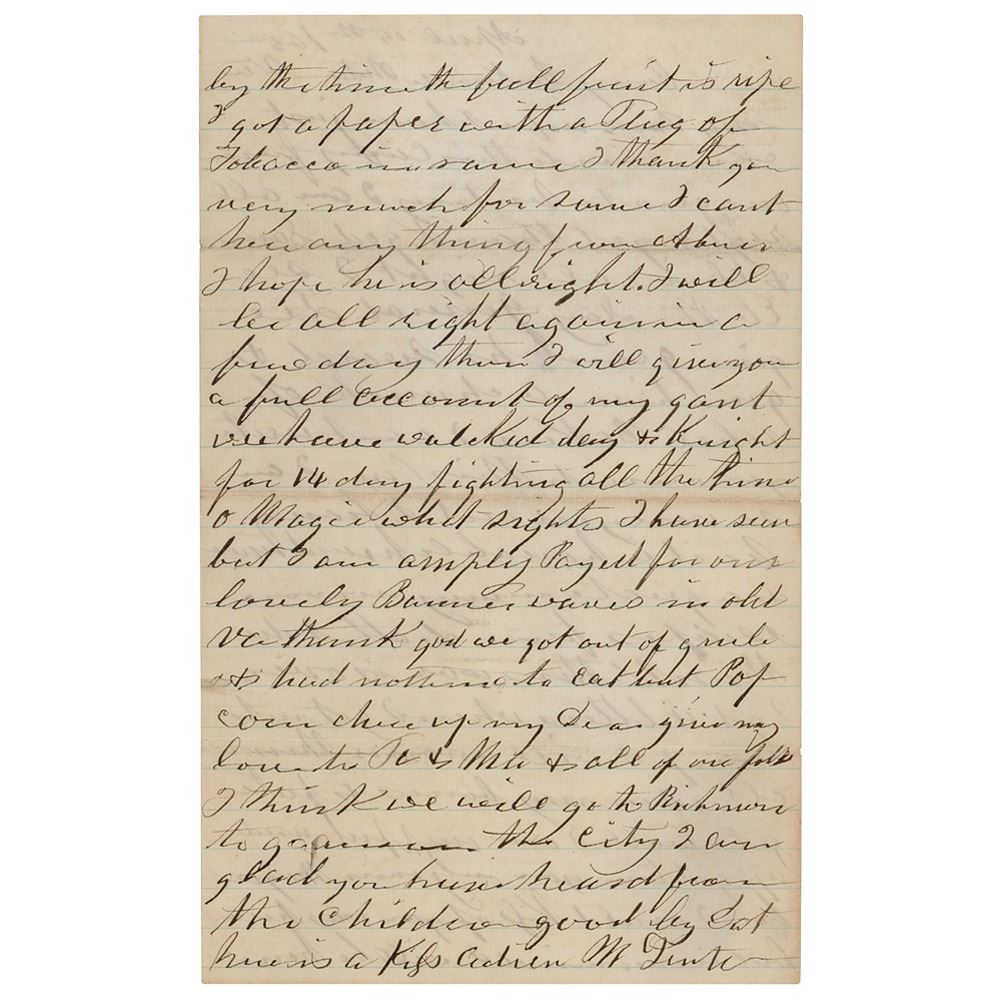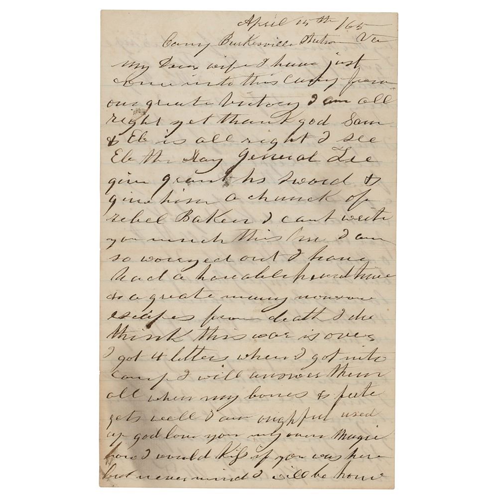 ALS from a soldier in the Civil War dated to April 15, 1865, the day that President Abraham Lincoln died. Penned by “M. Fink” to his wife, the handwritten letter, 5 x 8, one page both sides, is addressed from “Camp Burkeville Station Va.,” the scene of one of the last battles in Virginia before the surrender at Appomattox. As news of Lincoln’s death had not yet reached that far south, the letter does not contain any remarks on his passing. It reads, in part: “I have just come into this camp from our great victory I am all right yet thank god Sam & Eb is all right I see Eb the day General Lee give Grant his sword & give him a chunk of rebel Baken I cant write you much this time I am so worried out I have a had horrable hard time & a great many narrow escapes from death I do think this war is over I got 4 letters when I got into camp I will answer them all when my bones & feete gets well I am oughful used up…I will be all right again in a few day & knight for 14 day fighting all the time O Magie what sights I have seen but I am amply Payed for our lovely Banner waves in Old Va thank god.” In fine condition.