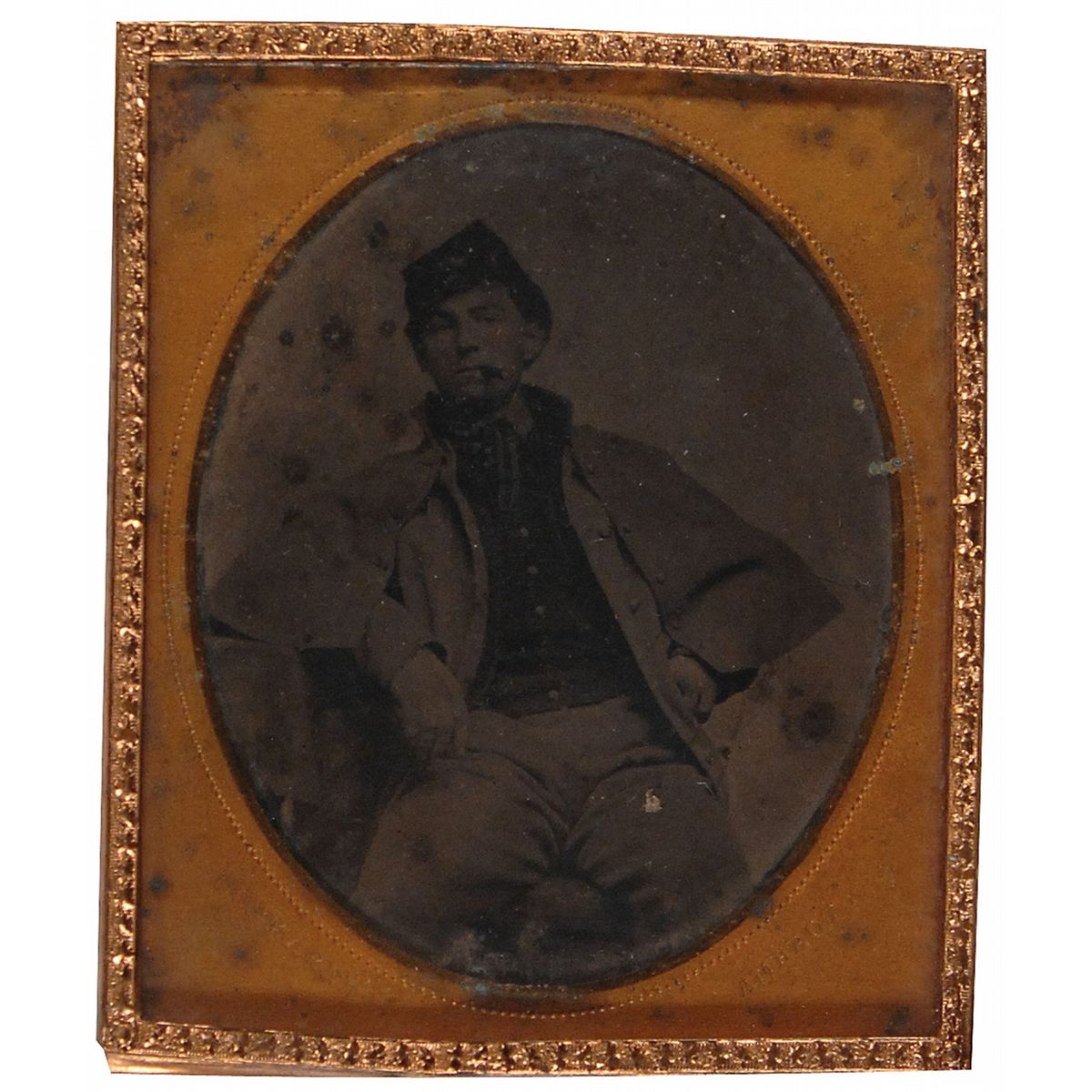 Original ambrotype of a young Confederate soldier in his uniform and infantry overcoat, a cigar clenched in his teeth, by Schoonmaker of New York, housed in its original 2.75 x 3.5 frame. In fine condition.