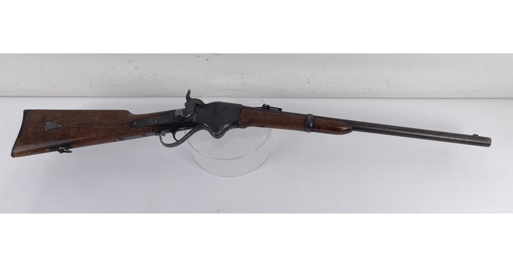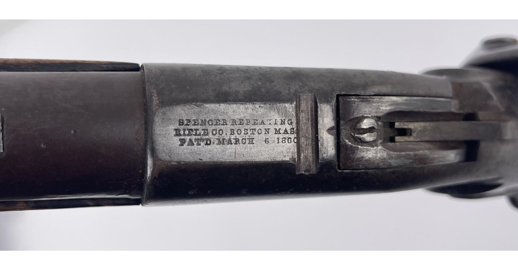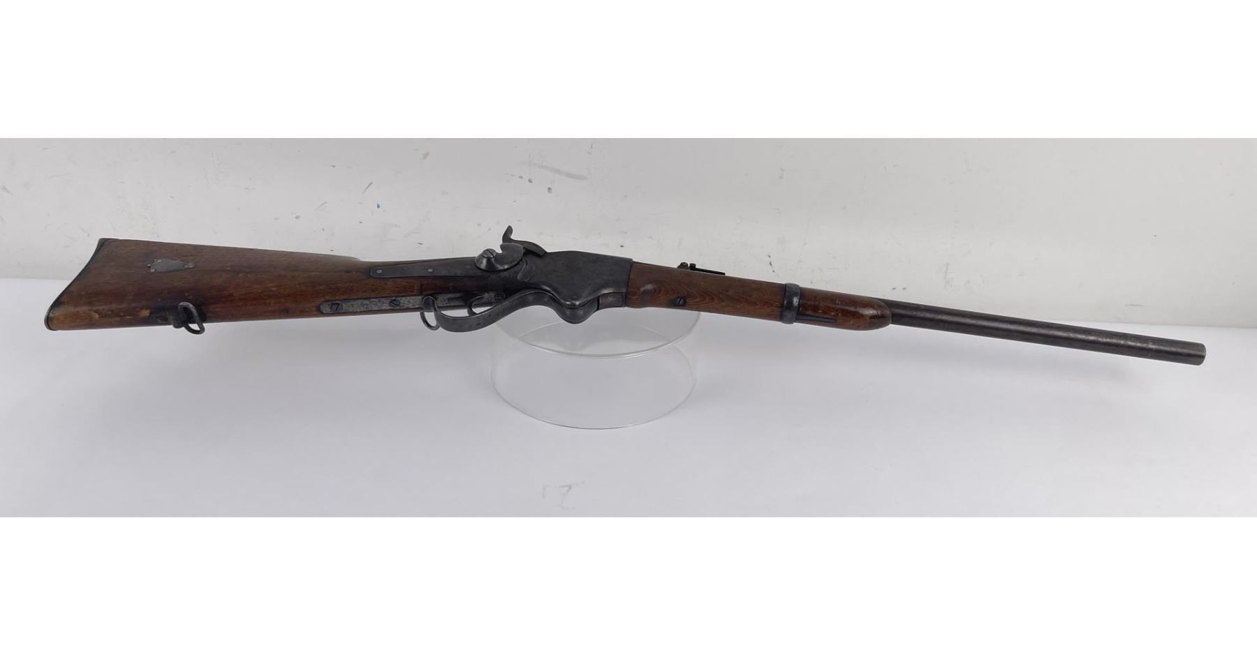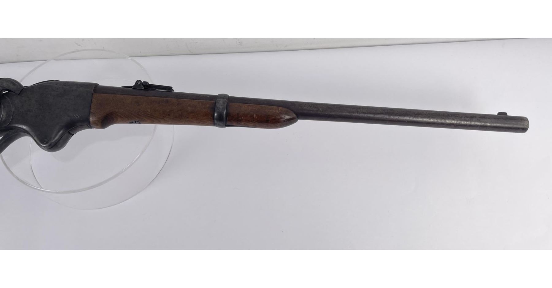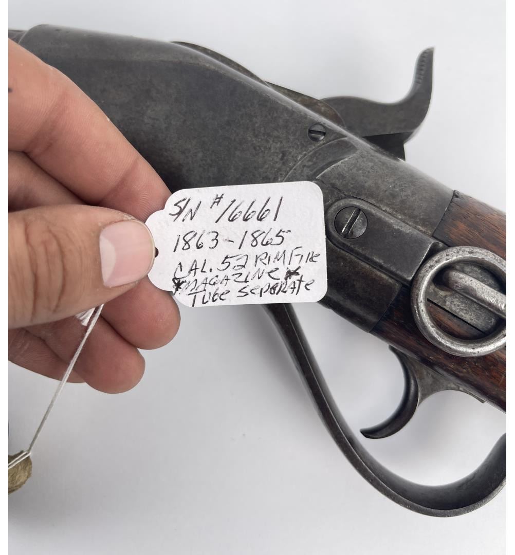 #16661 Made 1863-1865, Cal. 52 Rim Fire, Serial Number Range 11000 to 61000. Top of receiver stamped "Spencer Repeating Rifle Co., Boston, Mass. Pat’d March 6, 1860. A small, shallow inlet (for sight?) cut into top of receiver directly behind stamping. Barrel length 22" and does not appear to have been lined. Magazine Tube is not original and fits a little bit tight. (Packed separately) Shield with brass pins on right side of butt stock. No inspector Marks could be found. Action working. No FFL Transfer required.