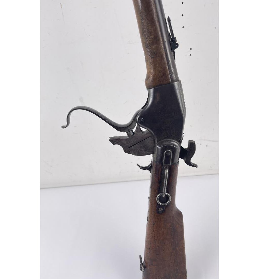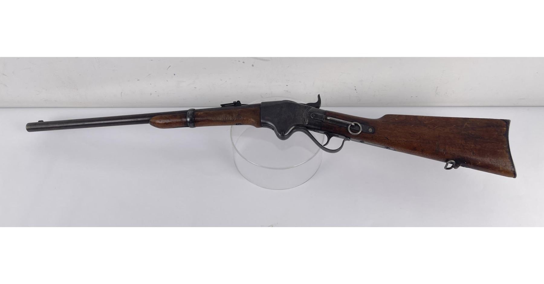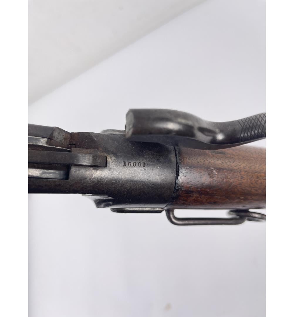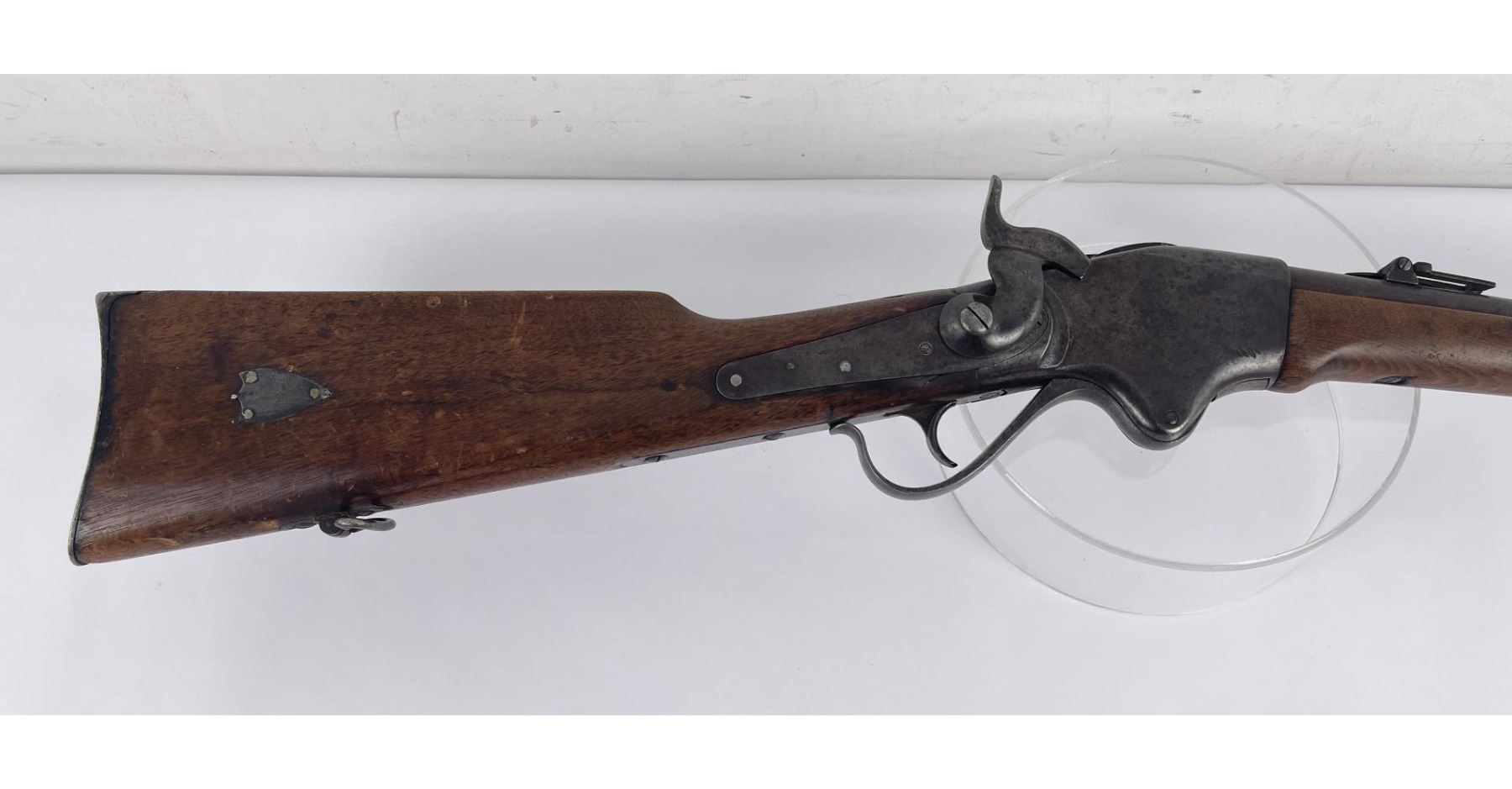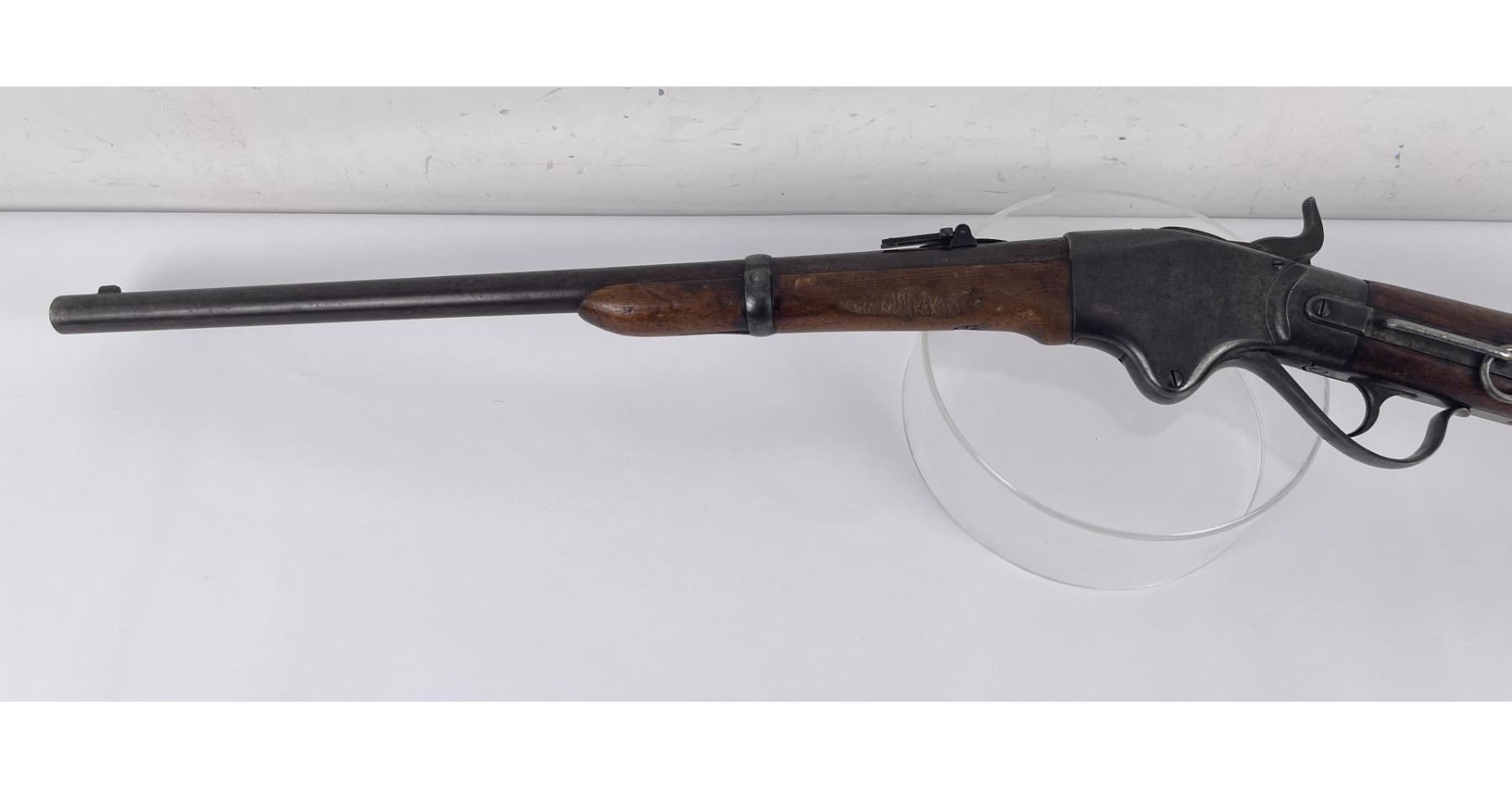 #16661 Made 1863-1865, Cal. 52 Rim Fire, Serial Number Range 11000 to 61000. Top of receiver stamped "Spencer Repeating Rifle Co., Boston, Mass. Pat’d March 6, 1860. A small, shallow inlet (for sight?) cut into top of receiver directly behind stamping. Barrel length 22" and does not appear to have been lined. Magazine Tube is not original and fits a little bit tight. (Packed separately) Shield with brass pins on right side of butt stock. No inspector Marks could be found. Action working. No FFL Transfer required.