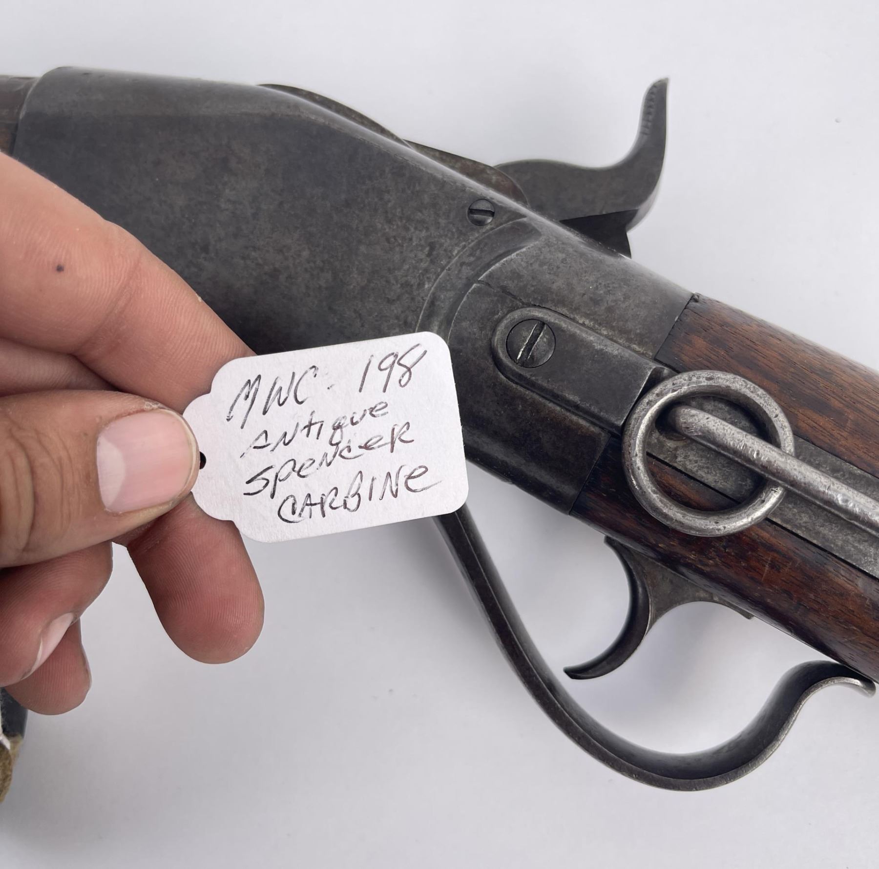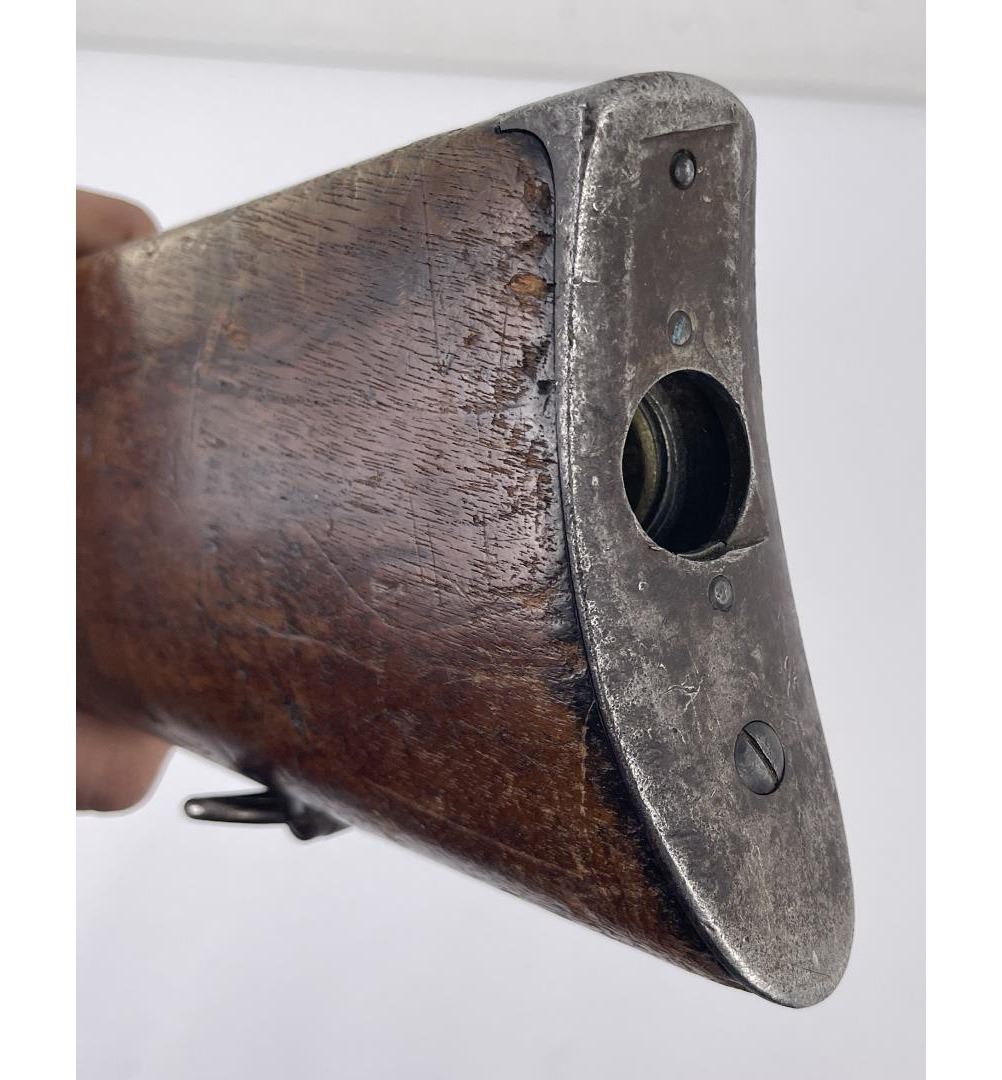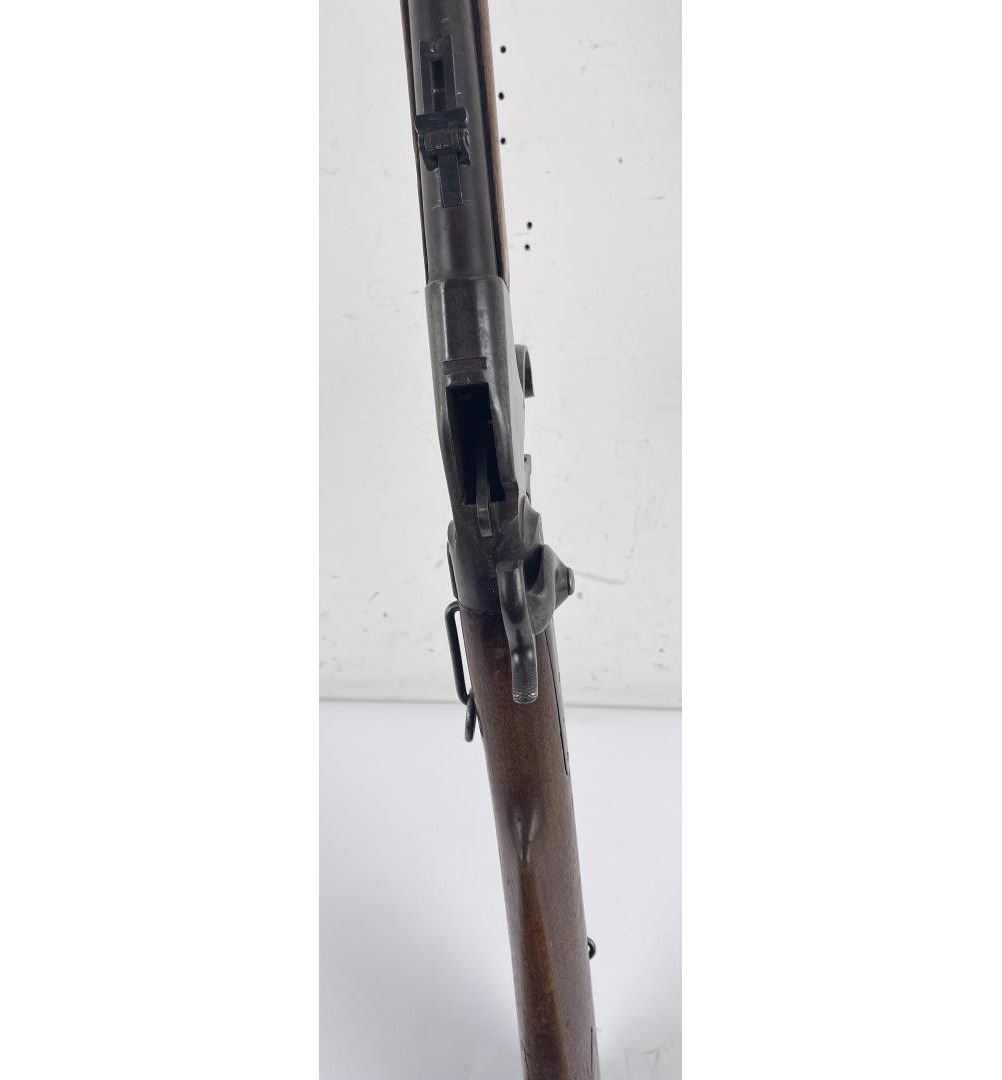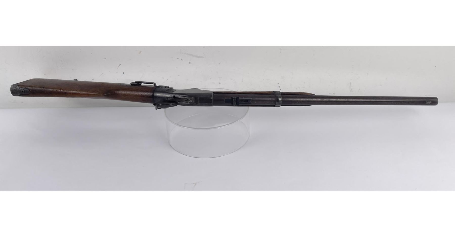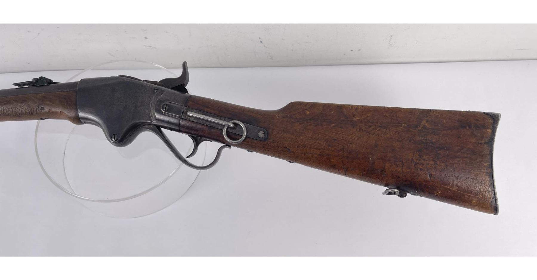 #16661 Made 1863-1865, Cal. 52 Rim Fire, Serial Number Range 11000 to 61000. Top of receiver stamped "Spencer Repeating Rifle Co., Boston, Mass. Pat’d March 6, 1860. A small, shallow inlet (for sight?) cut into top of receiver directly behind stamping. Barrel length 22" and does not appear to have been lined. Magazine Tube is not original and fits a little bit tight. (Packed separately) Shield with brass pins on right side of butt stock. No inspector Marks could be found. Action working. No FFL Transfer required.