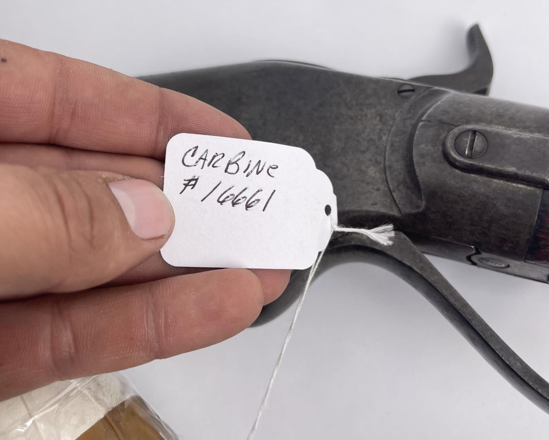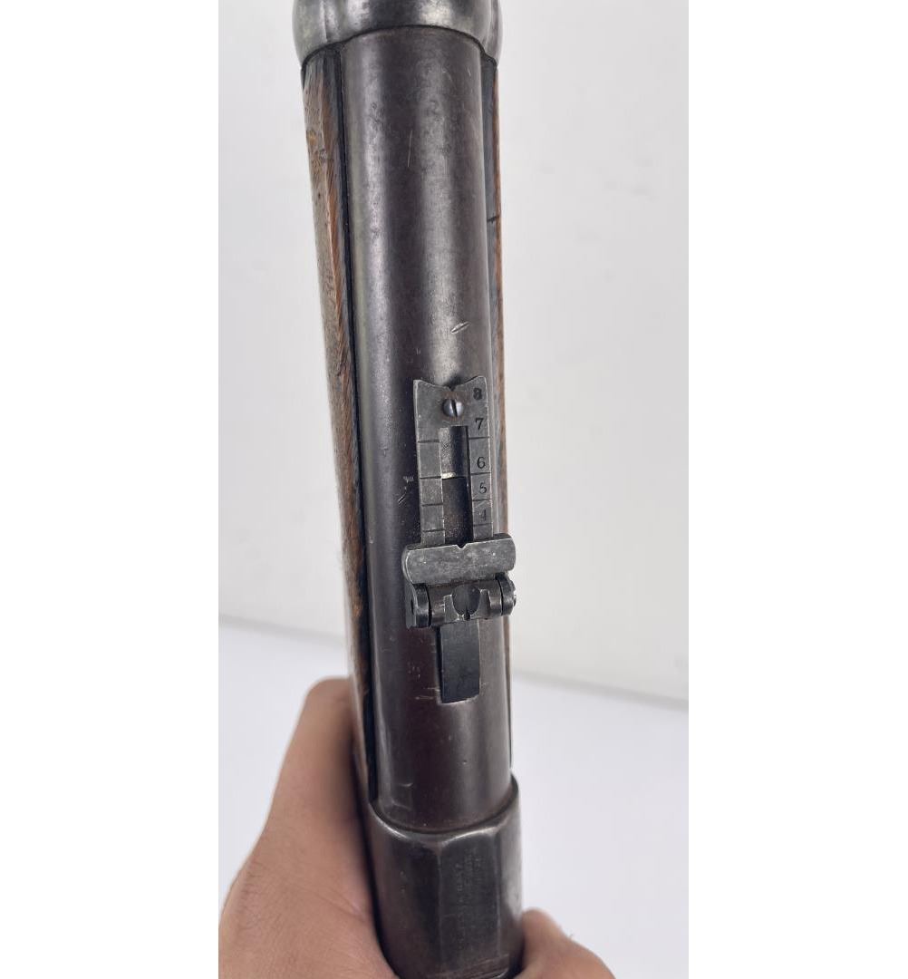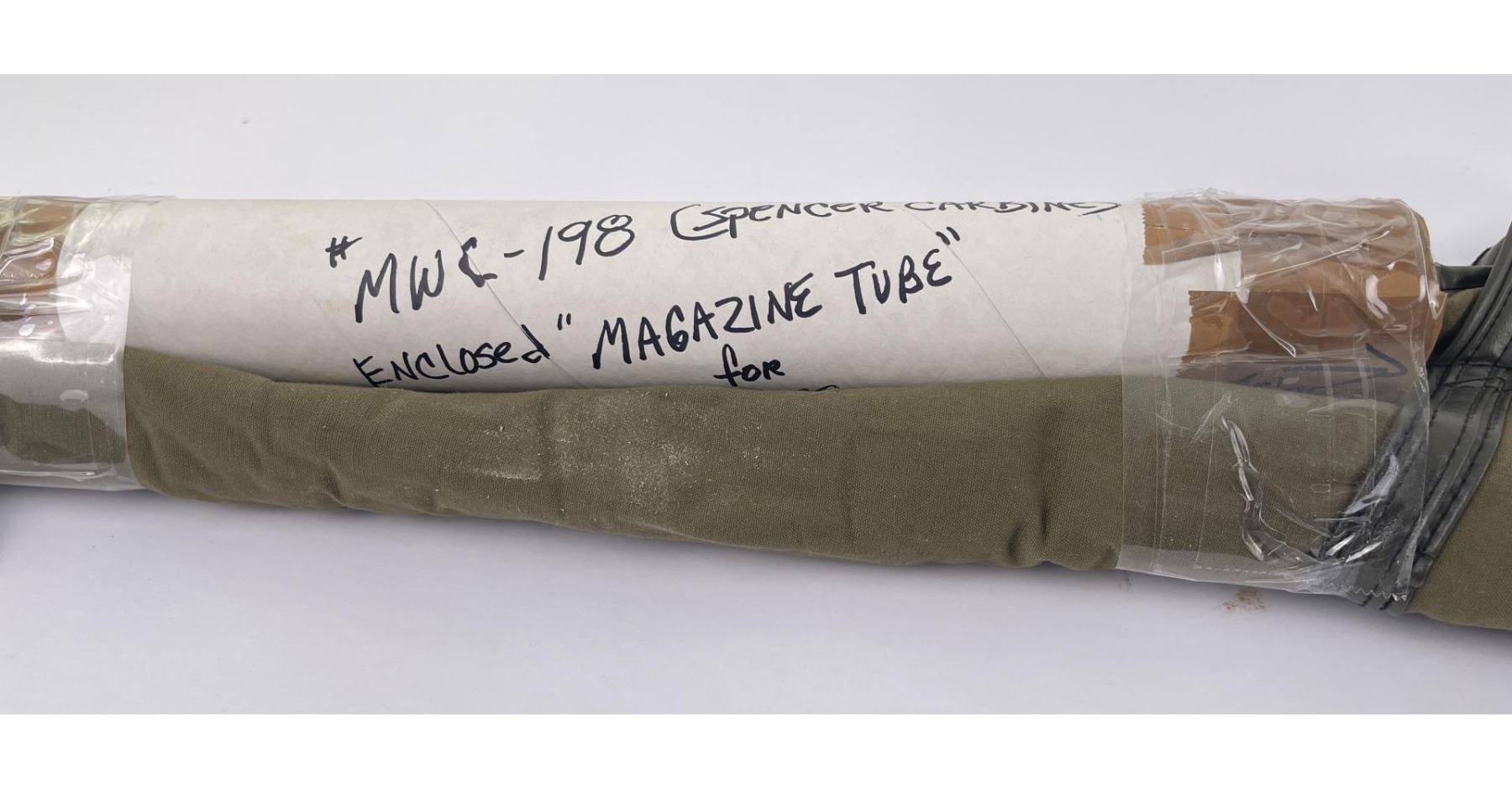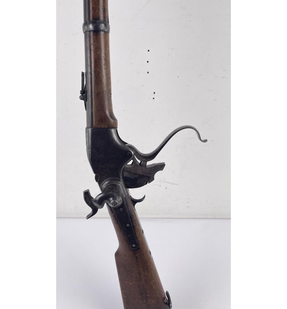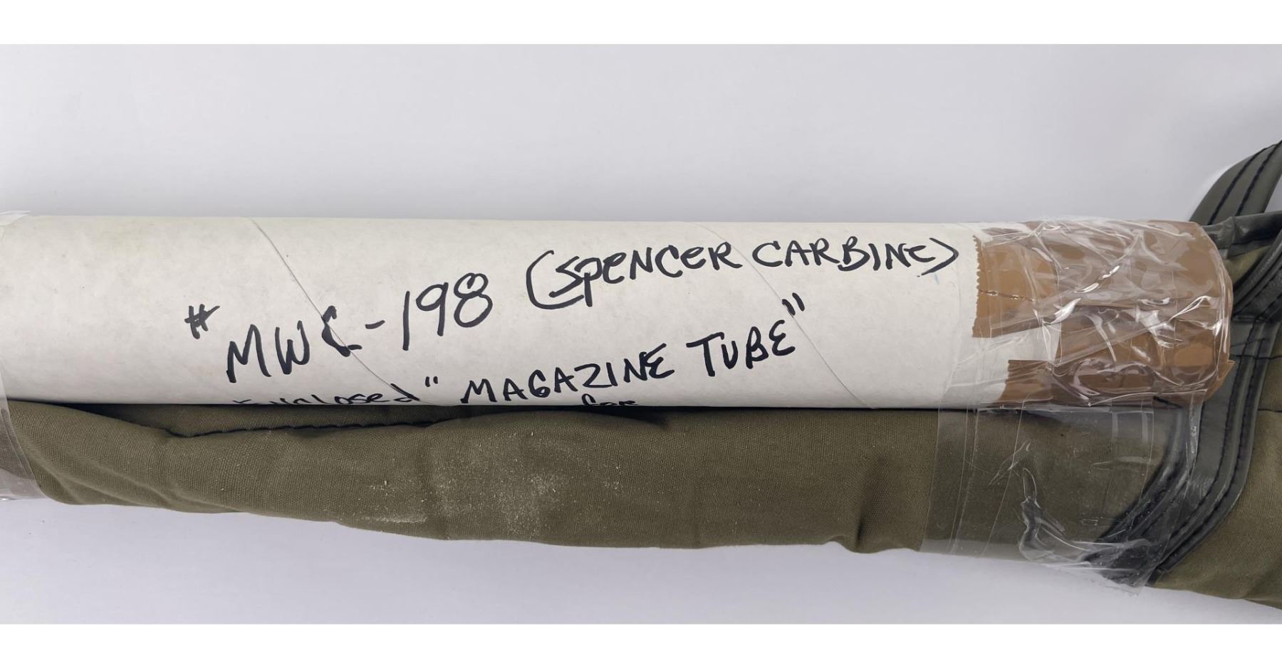 #16661 Made 1863-1865, Cal. 52 Rim Fire, Serial Number Range 11000 to 61000. Top of receiver stamped "Spencer Repeating Rifle Co., Boston, Mass. Pat’d March 6, 1860. A small, shallow inlet (for sight?) cut into top of receiver directly behind stamping. Barrel length 22" and does not appear to have been lined. Magazine Tube is not original and fits a little bit tight. (Packed separately) Shield with brass pins on right side of butt stock. No inspector Marks could be found. Action working. No FFL Transfer required.