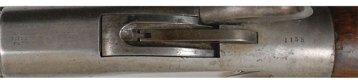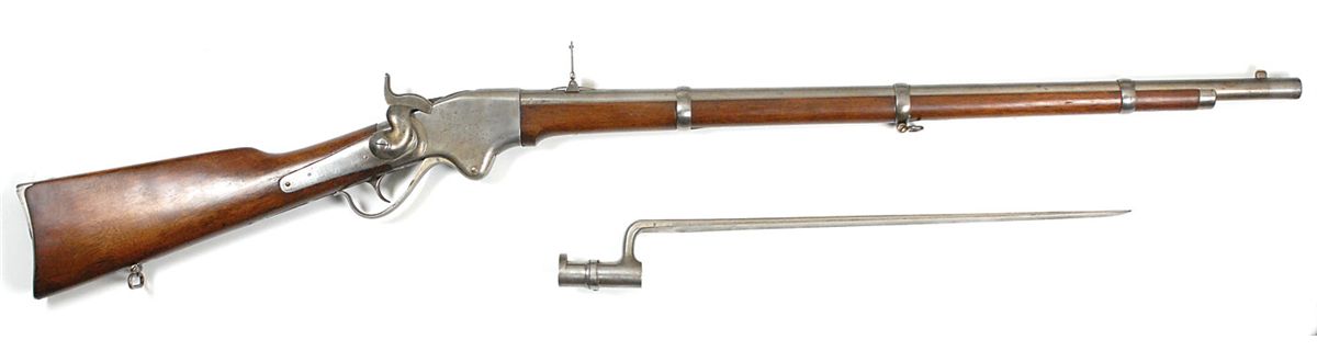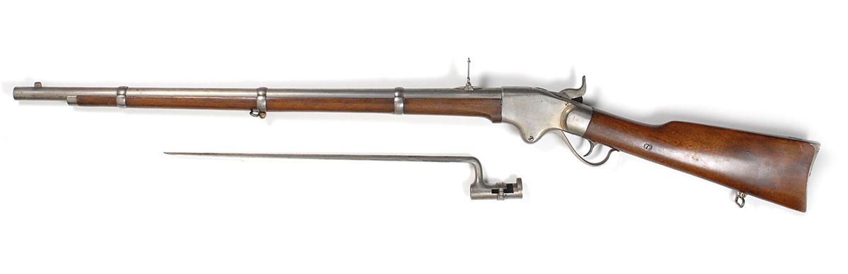 Serial number 1155, caliber 56-56 Spencer rimfire. This serial number falls within the serial range of those Army rifles used by Custer's Fifth Michigan Cavalry at Gettysburg according to Norm Flayderman's guide and the buyer of this rifle would be advised to do further research. The 30? round barrel has strong six-groove rifling with some scattered light pitting. All of the metal has a light gray patina with most of the surfaces smooth, only the right side of the same showing scattered fine pitting. The top of the frame has the worn but legible manufacturer's marking "SPENCER REPEATING / RIFLE CO. BOSTON, MASS. / PAT'D MARCH 6, 1860." The flat on the right side of the barrel over the chamber has light impressions from a vise, the flat on the left side has military inspector's initials "S.L." The buttstock has inspector's initials "J.L.K." behind the lower tang. The forend has a repaired grain crack on the left side of the barrel channel behind the lower band. Both stocks have some extra added oil finish and show almost no wear with only tiny handling marks. The mechanism is complete and works well. This is a particularly attractive Spencer Rifle and it comes with an original unmarked bright steel socket bayonet with an 18? blade that is in excellent condition.