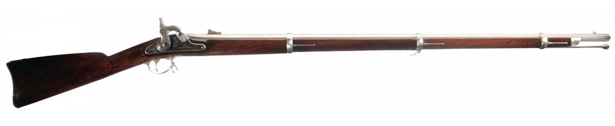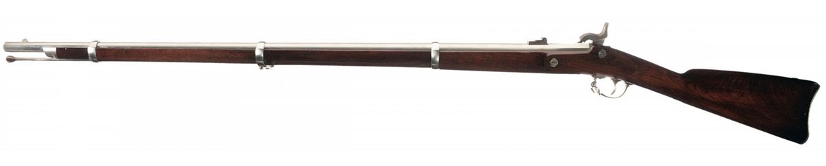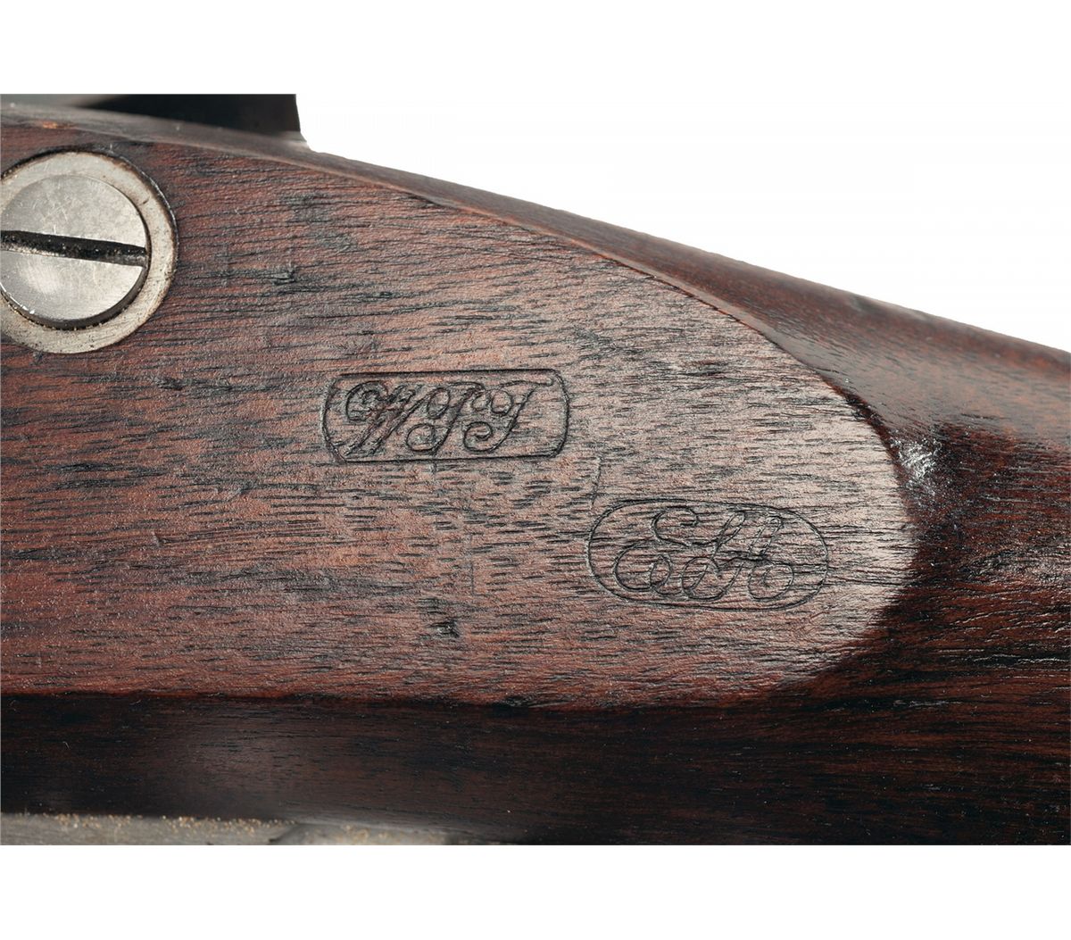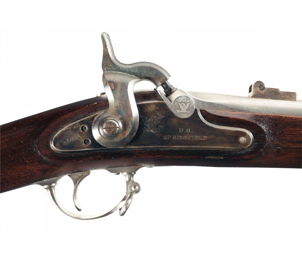 Condition: Very fine, as issued. The musket is bright and shows only traces of firing wear and remains in nearly new condition. The lock plate and hammer retains 95% of the original casehardened finish. The right sight has 80% of the blue finish intact. The bolster has traces of flash pitting behind the nipple but there is no evidence of flash pitting on the barrel. All of the markings on the lock, barrel and buttplate are clear. The Ordnance inspection marks on the left stock flat are nearly perfect. The stock is in excellent condition with sharp edges on the left flat, around the edges of the lock plate and on the edge of the barrel channels. The stock shows only a few, very minor, storage marks. This is a very good example of the last muzzle-loading weapon made by Springfield Armory and the last percussion rifle-musket issued to the U.S. Army.