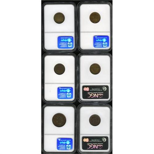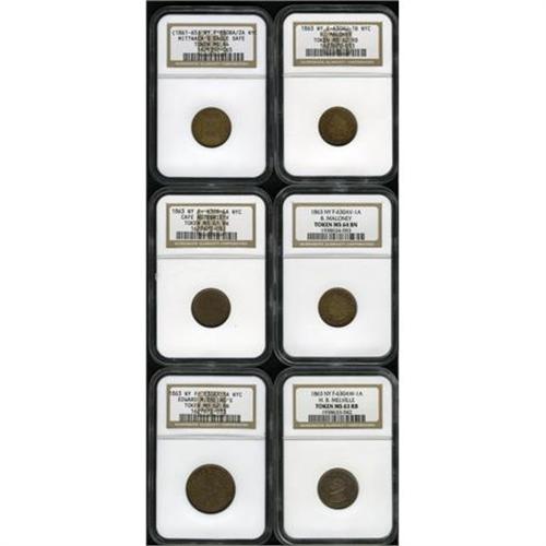 <B>Civil War Store Card Lot.</B></I> All from New York, NY. Consists of: an <B>1863 B. Maloney, Fuld-NY-630AU-1b, R.4, MS62 Red and Brown NGC; 1863 B. Maloney, Fuld-NY-630AU-1a, R.2,</B></I> misattributed as 630AV-1a on the holder; <B>1863 H.B. Melville, Fuld-NY-630AW-1a, R.4, MS63 Red and Brown NGC; 1863 Edward Miehling's, Fuld-NY-630AX-1a, R.1, MS62 Brown NGC; 1863 Cafe Autenrieth, Fuld-NY-630B-4a, R.1, MS61 Brown NGC;</B></I> and an <B>(1861-65) G.M. Mittnacht's Eagle Safe, Fuld-NY-630BA-2a, R.3, MS64 NGC.</B></I> Catalog value in MS60 is $195; this high-grade lot should exceed that figure by a wide margin.<BR><BR><b>Shipping:</b> Coins & Currency (<a target="_blank" href="http://www.heritageauctions.com/common/shipping.php">view shipping information</a>)
