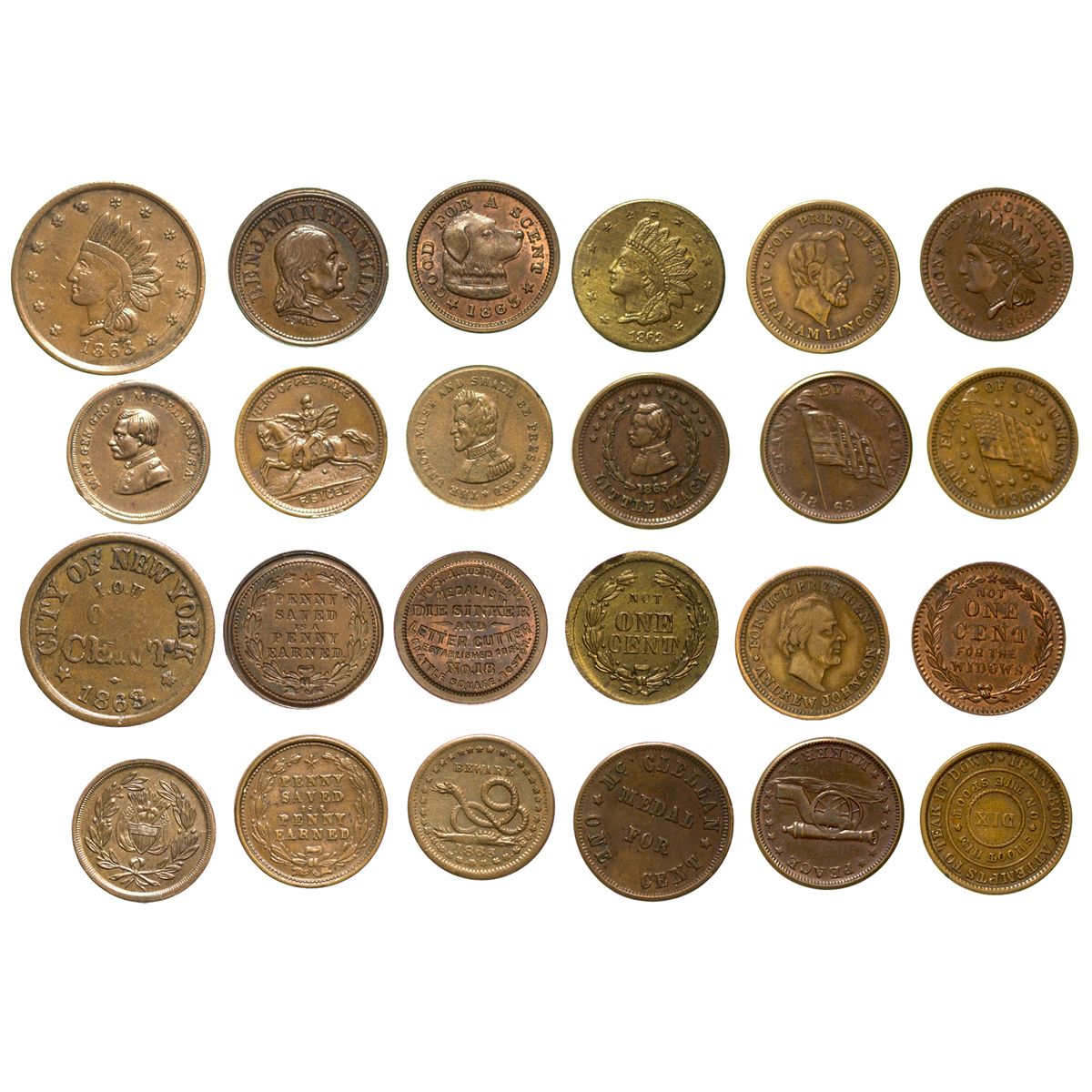 Lot of 12. 1) 1864 Lincoln & Johnson Campaign Medal, DeWitt AL1864.67. 2) Civil War Boston Gem UNC, #115E. 3) Civil War McClellan, 142/347. 4) Civil War, 151/430. 5) Civil War 1863, 169/312. 6) Civil War 1863, 180/341. 7) Civil War 1863, 209/414. 8) Civil War 1863, 140/394. 9) Civil War 1863, 136/397; Civil War. 10) City of New York 1863, #630Q. 11) Civil War 1863, 97/389. 12) Civil War 1863, 68/360. - Weber Collection