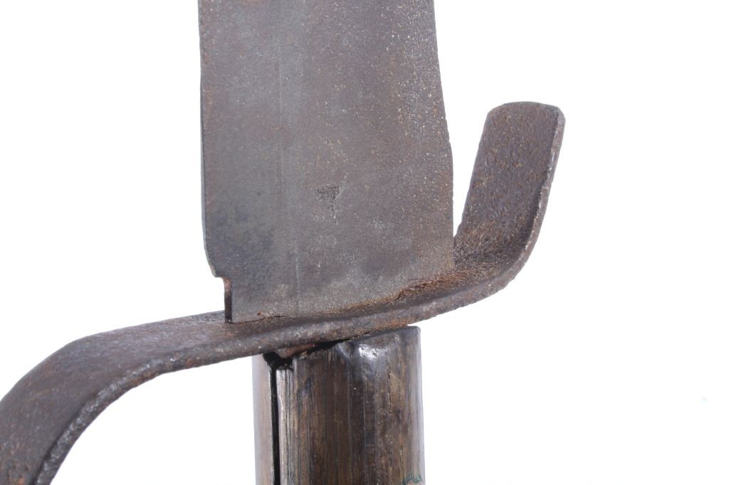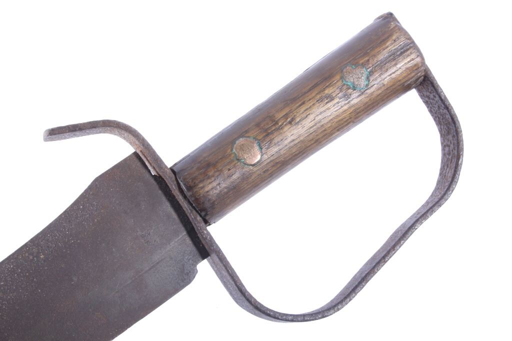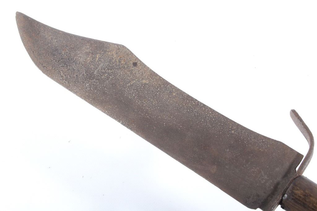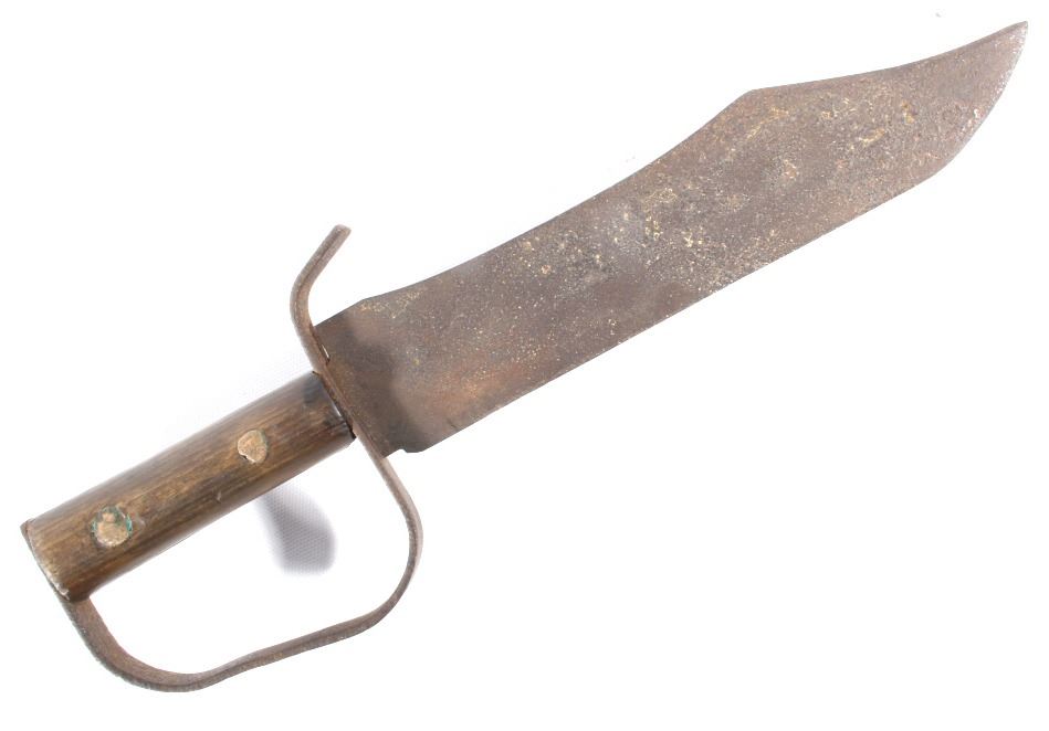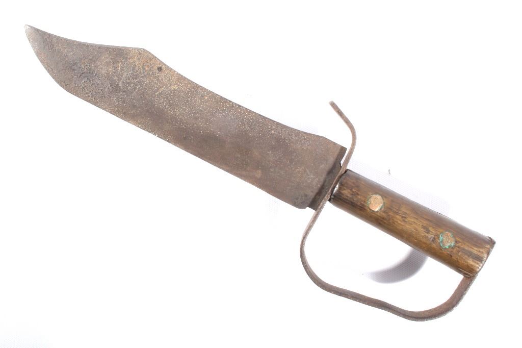 Available for purchase is this Large Civil War Confederate Style D-Guard forged iron Bowie Knife. The knife features a heavy forged like blade, matching D-Guard and wood handle/grip secured with copper rivets. Overall the piece measures 14 inches in length making it a larger size fighting side knife that was particularly popular with soldiers of the Confederacy. Numerous Civil War photos exist showing southern volunteers with their muskets and various size D-Guard Bowies. The knife features a weathered one-piece wood grip with the wood and metal having a heavy pitted oxidized finish. Wonderful rare piece done in the style of a Civil War/Confederate display piece seldom offered. Provenance: From the personal collection of Darryl Fisher. Age and origin of the piece are not confirmed. The knife features a 9 1/2" blade, forged hand guard, wooden handle, and copper rivets.