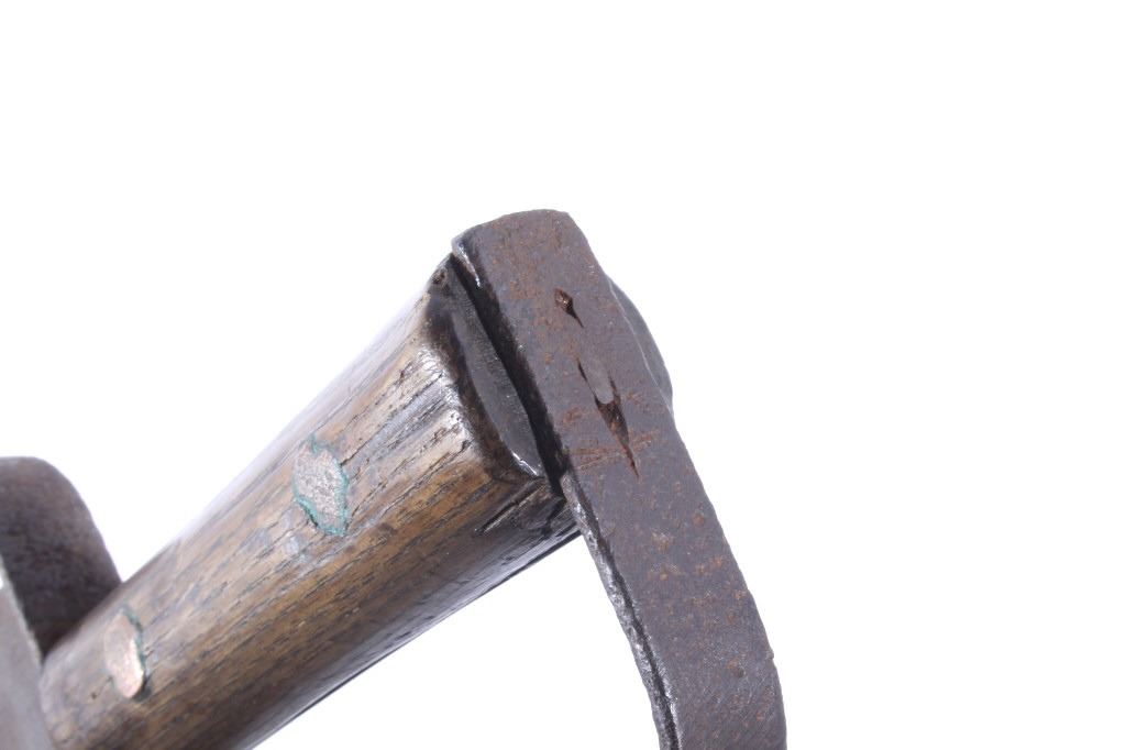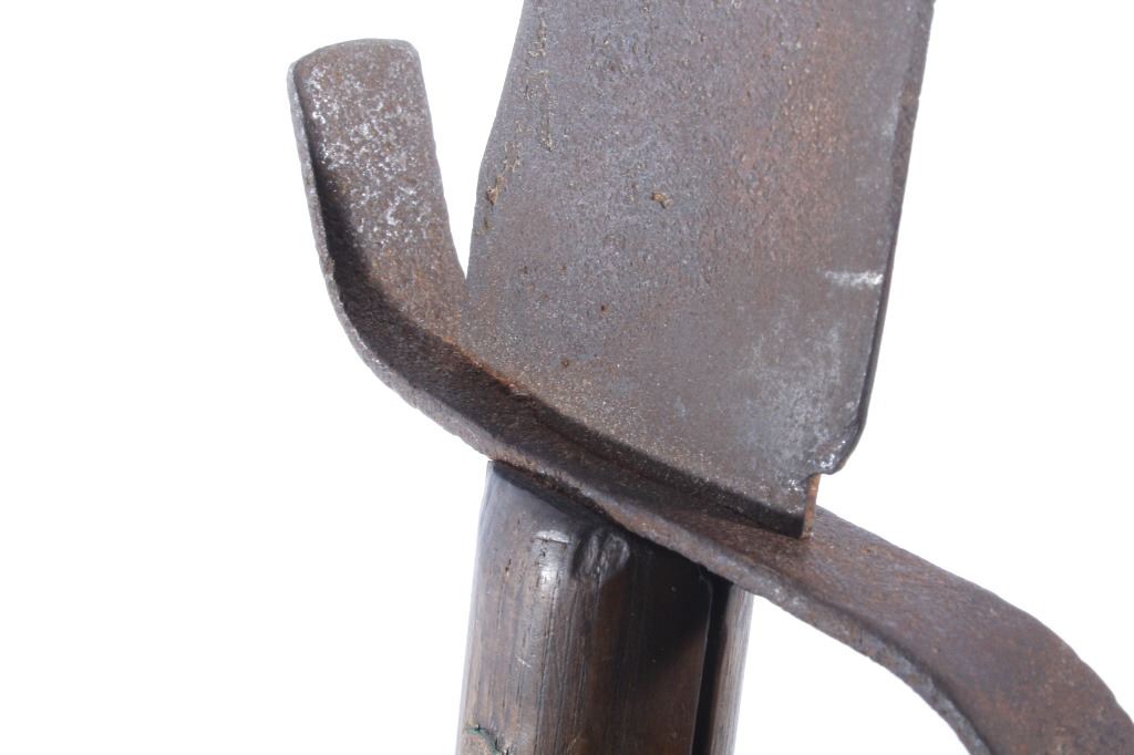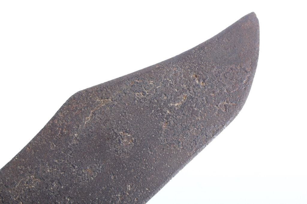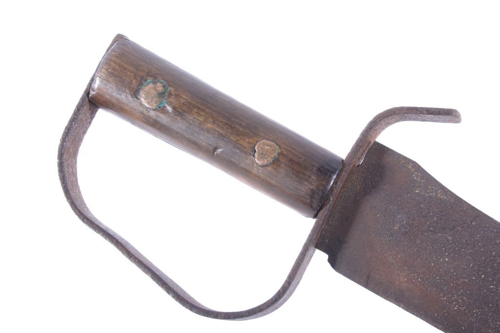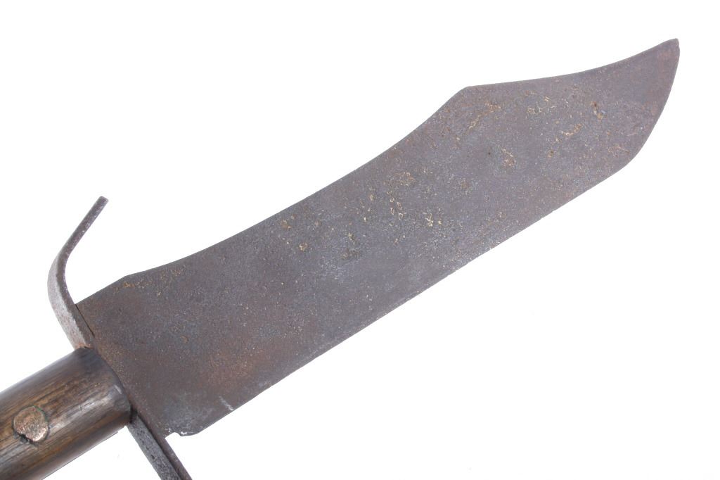 Available for purchase is this Large Civil War Confederate Style D-Guard forged iron Bowie Knife. The knife features a heavy forged like blade, matching D-Guard and wood handle/grip secured with copper rivets. Overall the piece measures 14 inches in length making it a larger size fighting side knife that was particularly popular with soldiers of the Confederacy. Numerous Civil War photos exist showing southern volunteers with their muskets and various size D-Guard Bowies. The knife features a weathered one-piece wood grip with the wood and metal having a heavy pitted oxidized finish. Wonderful rare piece done in the style of a Civil War/Confederate display piece seldom offered. Provenance: From the personal collection of Darryl Fisher. Age and origin of the piece are not confirmed. The knife features a 9 1/2" blade, forged hand guard, wooden handle, and copper rivets.
