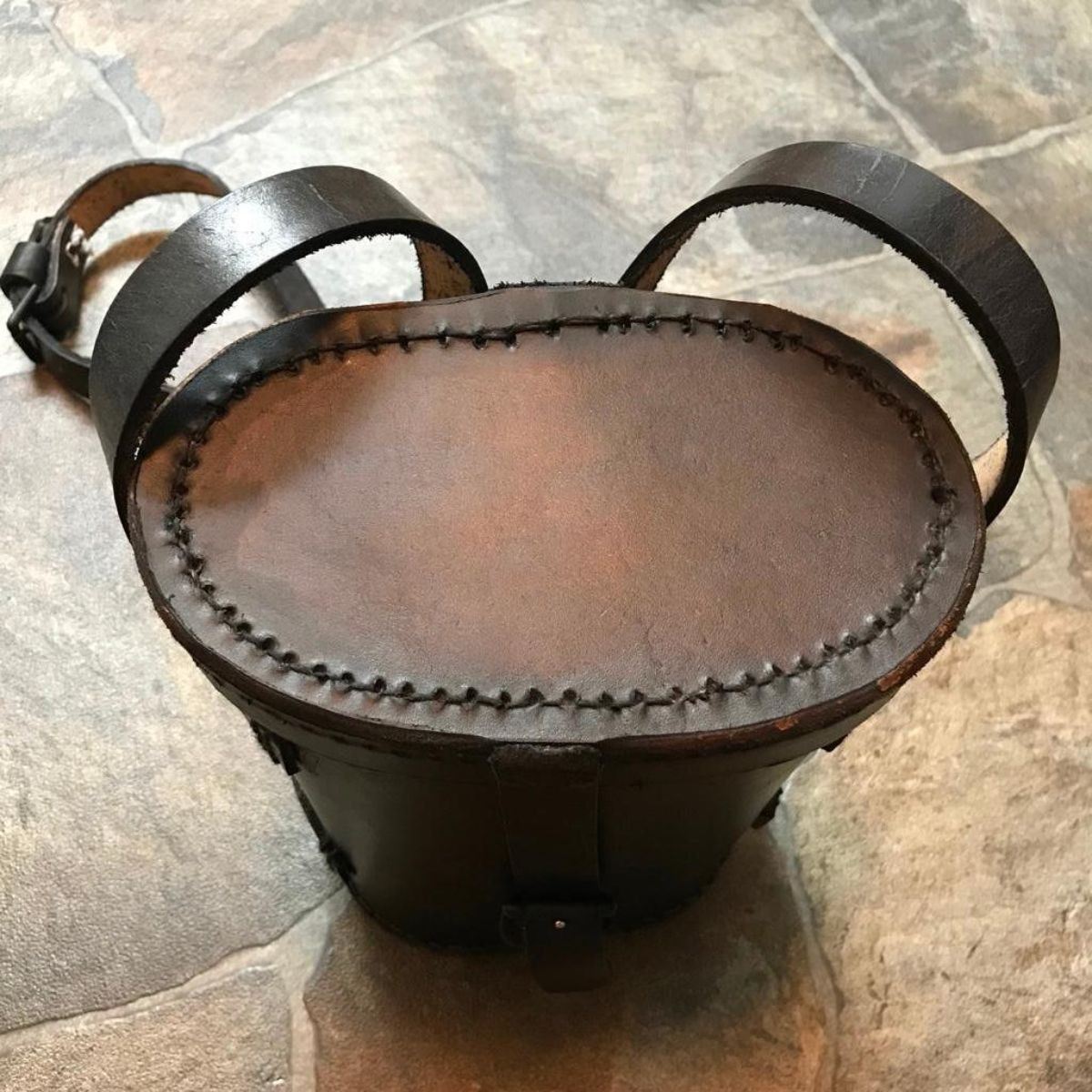 Civil War style binoculars & case for Civil War re-enactors or theatre set prop. Period correct top quality reproduction Regimental Quartermaster's item, brass & metal field binoculars. Hand-made period-correct thick leather case, with correct Depot cartouches & buckles. Made by LaPierre Sutlery (high-end Civil War re-enactor accouterment maker. 5 1/4" L X 4 3/4" W binoculars. 8" H X 7"W X 4" D case.