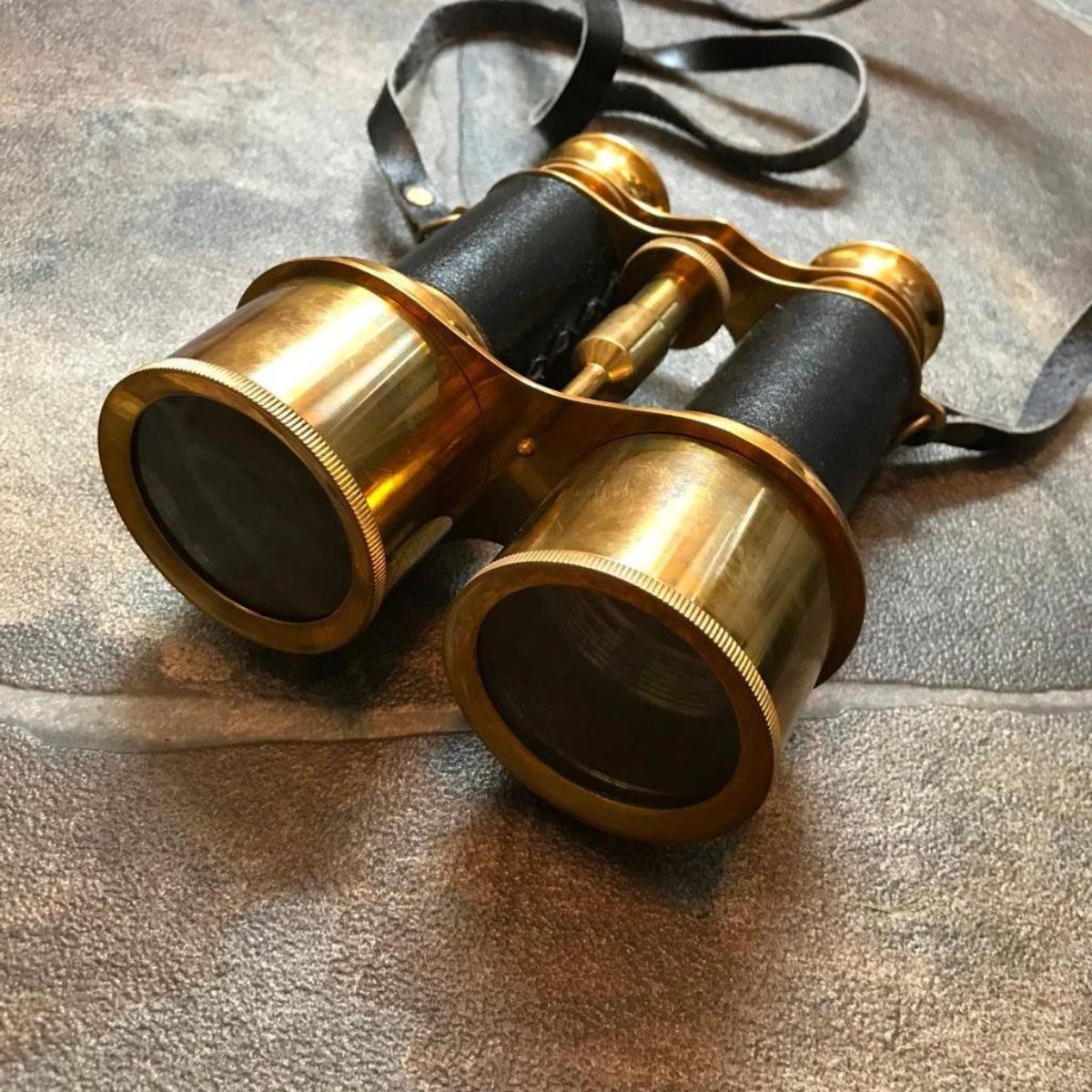 Civil War style binoculars & case for Civil War re-enactors or theatre set prop. Period correct top quality reproduction Regimental Quartermaster's item, brass & metal field binoculars. Hand-made period-correct thick leather case, with correct Depot cartouches & buckles. Made by LaPierre Sutlery (high-end Civil War re-enactor accouterment maker. 5 1/4" L X 4 3/4" W binoculars. 8" H X 7"W X 4" D case.