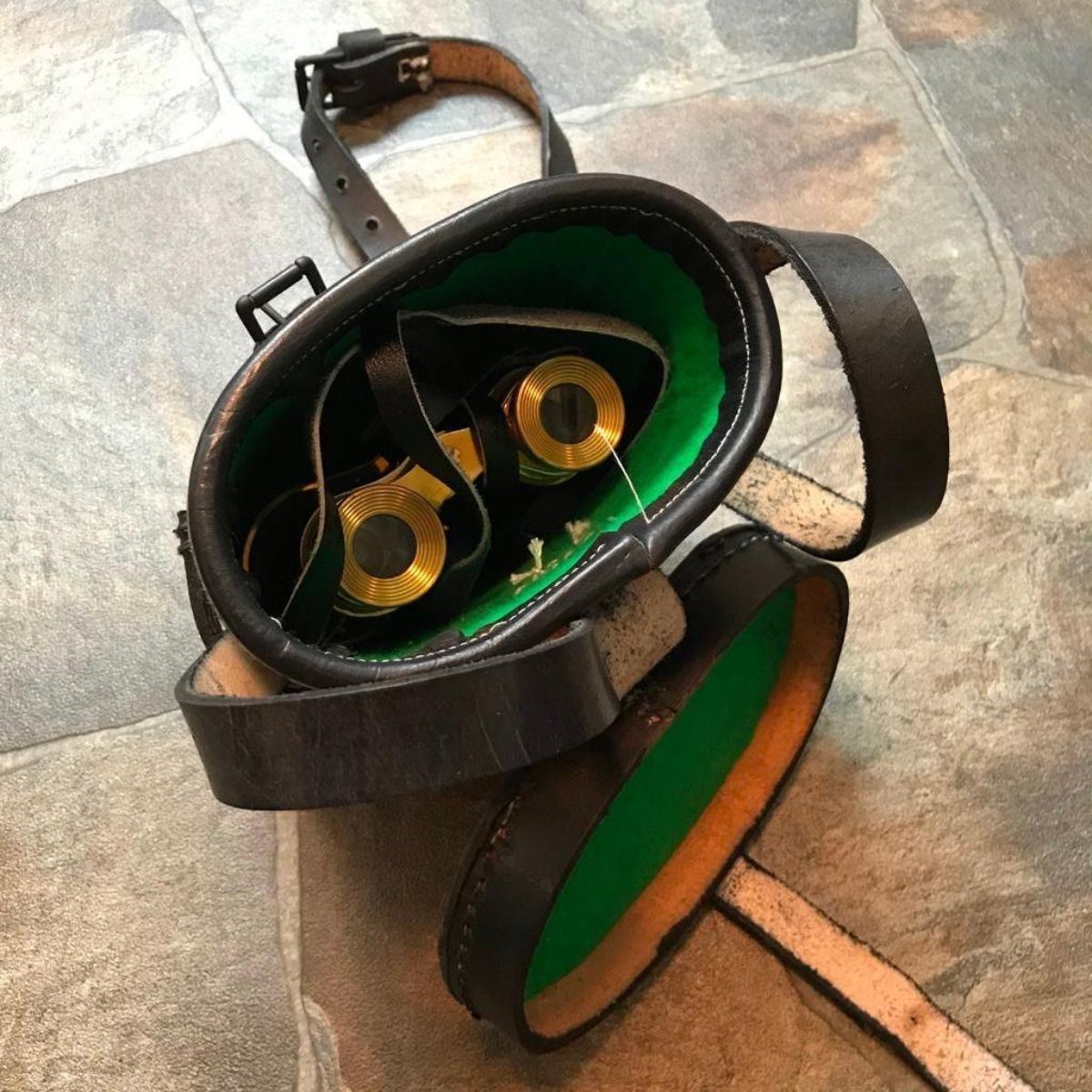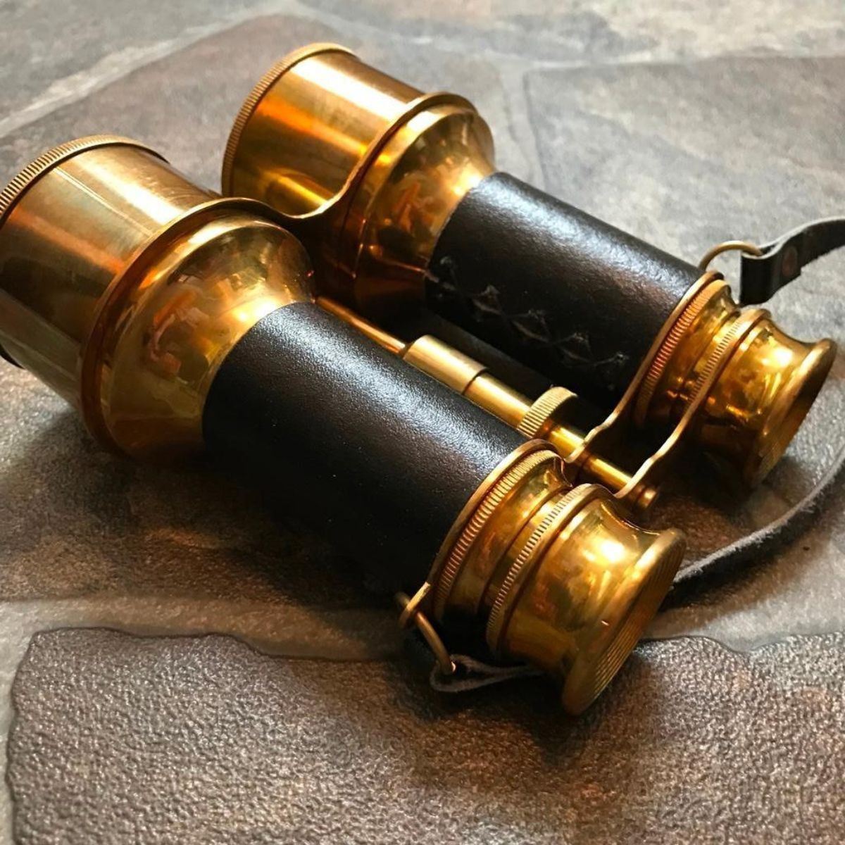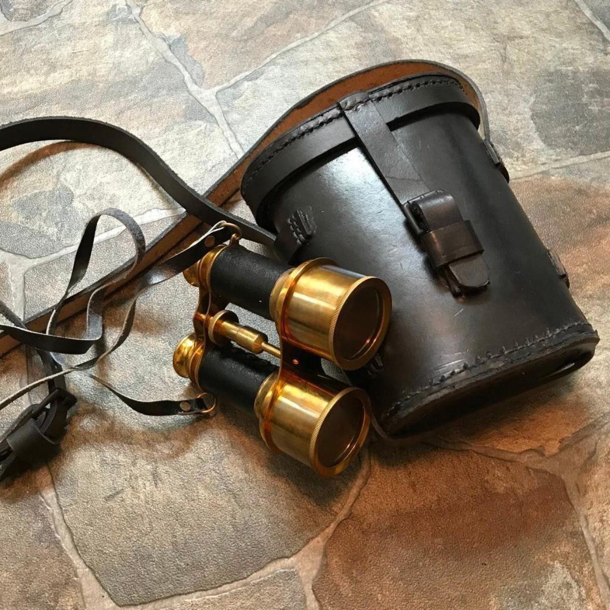 Civil War style binoculars & case for Civil War re-enactors or theatreset prop. Period correct top quality reproduction Regimental Quartermaster'sitem, brass & metal field binoculars. Hand-made period-correct thick leather case, with correct Depot cartouches & buckles. Made by LaPierre Sutlery (high-end Civil War re-enactoraccouterment maker. 5 1/4" L X 4 3/4" W binoculars. 8" H X 7"W X 4" D case.