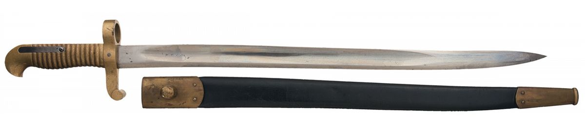 Measuring 25 inches overall, with a 20 1/4 inch single fuller blade with subtle yataghan profile, stamped "H" on the left ricasso. Cast ribbed brass hilt, with "C" on the left side of the guard and "B.H." on the rear. Black leather scabbard, with brass fittings and "J" on the frog stud. Reportedly for Sharps rifle, but cannot verify.