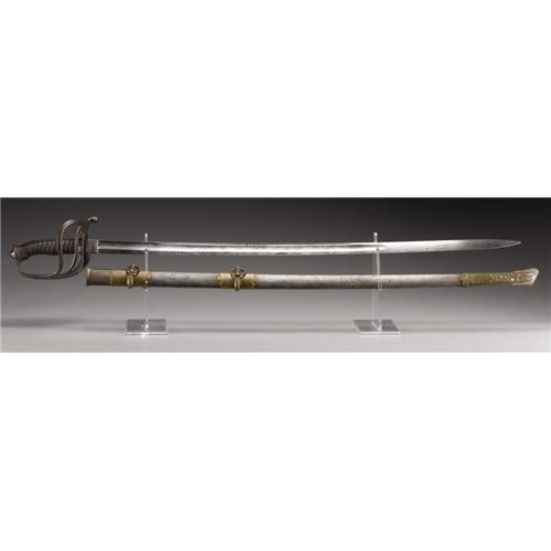 <B>Civil War Presentation Sword - Captain Samuel A. Moore of the 14th Connecticut Infantry who Fought at Gettysburg.</B></I> This Clauberg infantry officer's sword made in Solingen, Germany was owned by Captain and future Lieutenant Colonel Samuel A. Moore of the 14th Connecticut Infantry, a unit that fought at Gettysburg. The unit was present at Petersburg and witnessed the Mine explosion and fought during the siege of the city. Captain Moore distinguished himself at Gettysburg, leading his men on July 2nd and 3rd of 1863 against the Confederates at Bliss Farm near Cemetery Ridge. As Confederate sharpshooters found their range, the men of Company "F" took heavy casualties, but the unit recovered and helped repulse Pickett's charge on July 3rd. A monument today stands at the Bliss Farmhouse at Gettysburg which commemorates the fight. <BR><BR>This sword was carried by Captain Moore and bears the maker's mark of "W. Clauberg" above the etched figure of a knight with "Solingen" below at the ricasso. Etching continues up the blade with a stand of colors, a federal shield and drums surmounted by foliate etching, the letters "U.S." and continued foliate etching to the length of the 21" double fuller. The reverse of the 32" blade includes the same engraving only with a federal eagle with a ribbon in its beak bearing the words "E. Pluribus Unum". The steel hilt of the sword has an even gray patina with a 4" twisted wire with ten turns around the ray skin grip. The hilt is in the 1822 British pattern as illustrated in John H. Thillmann's <I>Civil War Cavalry and Artillery Sabers</B></I> (page 462). The steel scabbard has two 3" brass mounts with rings and a trumpet throat and a 6" drag, all brass. At the upper mount, above the engraved laurel wreath band, is engraved the soldier's name "Capt. S. A. Moore". The scabbard shares the same even gray patina as the sword making this not only a historic piece, but an attractive one as well. <BR><BR>Captain Moore's red field chair with his initials and unit information is being offered in a separate lot in this auction. <BR><BR><B>Provenance:</B></I> <I>The Headley Collection</B></I><BR><BR><b>Shipping:</b> Other (oversized items, group lo (<a target="_blank" href="http://www.heritageauctions.com/common/shipping.php">view shipping information</a>)