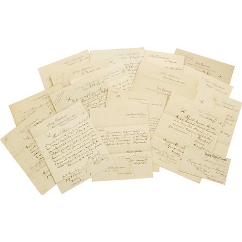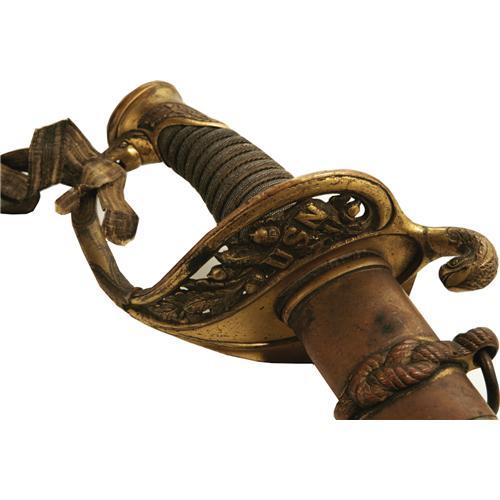 <B>Rear Admiral George W. Beaman Civil War Sword and Archive.</B></I> This substantial collection follows the career of George William Beaman (1837 - 1917), a distinguished U. S. Naval officer whose professional life began, oddly enough, as a journalist. A Vermont native and Massachusetts resident, Beaman went to Missouri as a very young man and worked for a newspaper in Hannibal, becoming friends with Mark Twain in the process. Beaman's Civil War service commenced in May, 1861 when he enlisted in a three-month reserve infantry regiment. The following year he joined the Navy as an Assistant Acting Paymaster and continued to serve faithfully until retiring in 1899. Beaman's primary Civil War assignments were with the South Atlantic Squadron until he was transferred to the Mississippi Flotilla in February, 1865. Post-war activities took Beaman around the world, with much of his work being conducted in the Pacific. This grouping is as follows:<BR>-<B>M1852 U. S. Navy Officer's Sword,</B></I> 35" overall length, 27.25" blade etched with patriotic naval motifs and maker's name on ricasso, stamped "Ames Mfg. Co. Chicopee Mass" on brass scabbard throat, wirebound ray-skin grip, brass guard with quillon terminating in dolphin's head, two brass rings on painted metal scabbard with brass drag fashioned as a dolphin. Original "attic" condition with deeply toned brass elements and bright, fresh blade. The scabbard's paint is scratched and chipped as to be expected. Very fine condition. This is the quintessential Civil War navy sword and was likely carried throughout Beaman's long career.<BR>-<B>12 CDVs showing Beaman in both civilian and military dress,</B></I> various locations, 1860 - early 1870s. A photographic timeline in which Beaman transforms from a rookie newspaperman into a seasoned young naval officer. Many of these images have penciled dates and locations. Some stains and normal aging, very good condition.<BR>-<B>Four CDVs of unidentified Union officers.</B></I> Two of these have Boston backmarks. They are likely Beaman's friends or relations. Very good condition.<BR>-<B>Three cabinet cards of a young cadet,</B></I> Boston, Massachusetts, ca. 1880s. The subject wears a double-breasted dress uniform with two rows of what appear to be Boston School staff buttons (Albert SU 43). Very fine condition.<BR>-<B>Three portraits of a retired Beaman,</B></I> Boston, Massachusetts, ca. 1900.<BR>-<B>Photograph of the U. S. S. <I>New York</B></I>,</B></I> 14" x 10.5", New York, 1893. Some chipping to mat and 2" split. Very good condition. Beaman served on this flagship of the North Atlantic Squadron near the end of his career.<BR>-<B>Albumen print,</B></I> 16.5" x 12.75", inscribed "<I>Picnic on a RR (near San Bartholomy) 1871</B></I>". A large group shot. Beaman appears to be one of the gentlemen in the back row. Splits and chipping on mat, none of which touches upon the actual print. Very good condition.<BR>-<B>18 Navy Department letters to Beaman,</B></I> approximately 20 pages, averaging 8" x 10", many on official letterheads, various locations, 1860s - 1899. These letters assign Beaman's postings with the last one pertaining to his retirement. Normal light aging, very fine condition.<BR>-<B>Two partially printed tea invitations from Queen Victoria,</B></I> addressed to Mrs. Beaman, 1892. With original envelopes. Fine condition.<BR>-<B>Two miscellaneous letters with ephemera.</B></I> Beaman's clipped obituary is included. Good condition.<BR><BR><b>Shipping:</b> Miscellaneous Collectibles, Larg (<a target="_blank" href="http://www.heritageauctions.com/common/shipping.php">view shipping information</a>) <BR><BR><B>Important notice