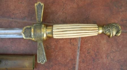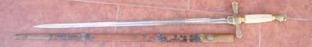 Civil War Sword 31 by 4 one half inches with leather scabbard, Has ox bone handle with brass trim. The scabbard has been torn and glued in two places. This is believed to be a Civil War Officers side arm. Shipping $18.50.