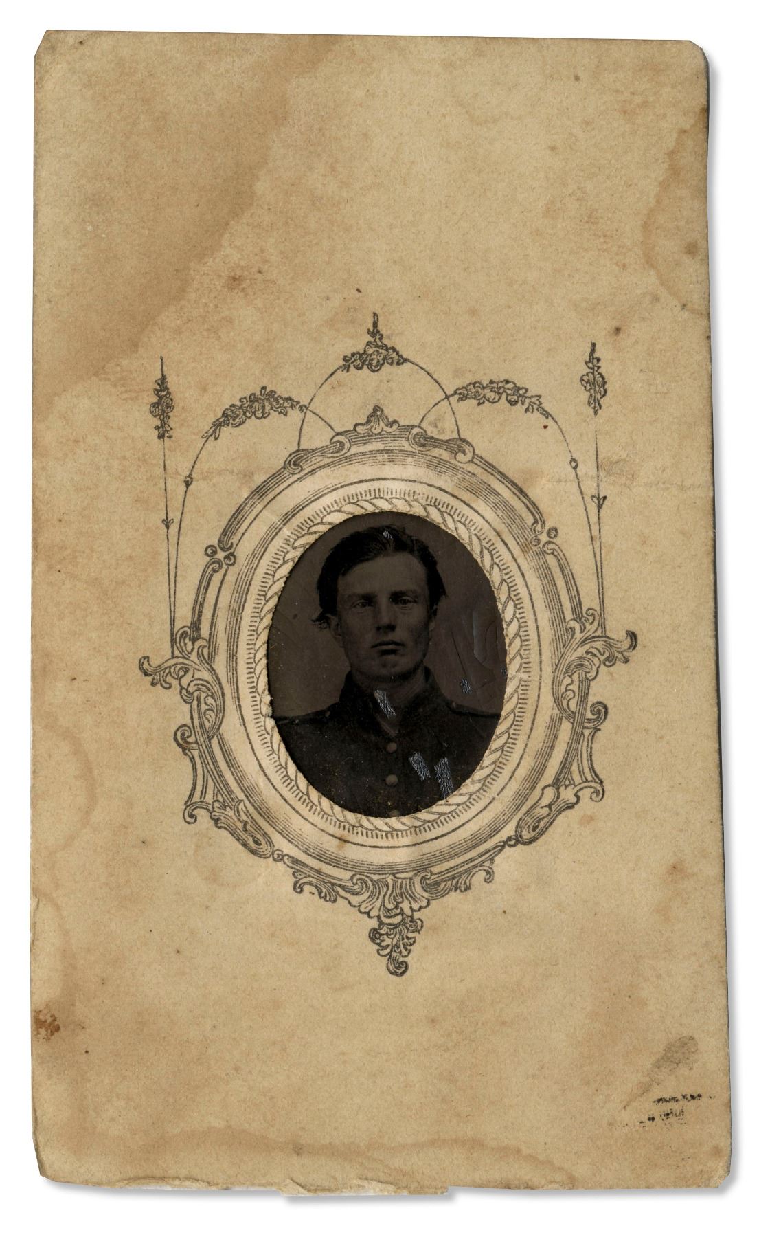 Civil War tintype portrait miniature of a Union soldier from the chest up. Oval shape measures about 1'' x 1'' and is mounted on a paper mat. An elaborate chandelier design printed on the card borders the photograph.