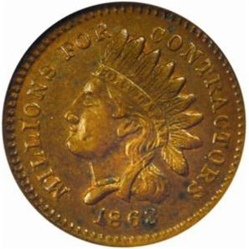 <style type="text/css"> body, td, th { font-family: Arial, Helvetica, sans-serif; font-size: 12px; color: #482424; margin: 0px; padding: 0px; } #header { background-image: url(http://www.bowersandmerena.com/ebay/images/template_v3_01.gif); clear: both; background-color: #590303; border-top-width: 2px; border-top-style: solid; border-top-color: #B38C4F;}#header #header_wrapper { height: 75px; clear: both; width: 800px; margin-right: auto; margin-left: auto; background-image: url(http://www.bowersandmerena.com/ebay/images/template_v3_03.gif); background-repeat: no-repeat; background-position: right; color: #F3EDCC;}#header #header_wrapper #header_logo { float: left; height: 75px; width: 444px; background-image: url(http://www.bowersandmerena.com/ebay/images/template_v3_02.gif); background-repeat: no-repeat; font-size: 10px; text-transform: capitalize; color: #B38C4F;}#header #header_wrapper #header_right { float: left; height: 75px; width: 356px; text-align: right;}#header #header_wrapper #header_right #headerLoginBtn { margin-bottom: 30px;}#header #header_wrapper #header_right input#txtSearch { color: #B49056; border: 1px solid #B49056; width: 175px; padding-top: 3px; padding-right: 3px; padding-bottom: 4px; padding-left: 3px;}#nav { height: 37px; background-image: url(http://www.bowersandmerena.com/ebay/images/template_v3_05.gif); clear: both;}#nav #nav_wrapper { height: 35px; width: 800px; margin-right: auto; margin-left: auto; border-left-width: 1px; border-left-style: solid; border-left-color: #B38C4F;}#nav #nav_wrapper a { padding-right: 15px; padding-left: 15px; border-right-width: 1px; border-right-style: solid; border-right-color: #B38C4F; height: 25px; padding-top: 10px; display: block; float: left; text-decoration: none; font-weight: bold; color: #5D0303;}#nav #nav_wrapper a:hover { color: #B38C4F;}#nav #nav_wrapper #search { float: right; padding-top: 7px;}#nav #nav_wrapper #search #txtSearch { font-family: Arial, Helvetica, sans-serif; font-size: 10px; text-transform: uppercase; color: #D2AE75; border: 1px solid #B38C4F; padding: 3px;}#content_bgd { background-image: url(http://www.bowersandmerena.com/ebay/images/template_v3_09.gif); background-repeat: repeat-y; background-position: center; padding-top: 15px; padding-bottom: 15px; background-color: #FBFBDB;}#content_wrapper { clear: both; height: auto; width: 800px; margin-right: auto; margin-left: auto;}.LotDetailWhite{ line-height:normal; font-size:13px; font-family: arial,helvetica,sans-serif; color: White; font-weight: bold;}.LotDetailInformation{ line-height:normal; font-size: 13px; font-family: arial,helvetica,sans-serif;}.LotDetailMessage{ line-height:normal; font-size: 13px; font-family: arial,helvetica,sans-serif; color: red;}}tr.HeaderAuctionTitle td { color: #000000; font-weight: bold; padding: 2px; background-image: url(http://www.bowersandmerena.com/ebay/images/template_v3_05.gif); background-repeat: repeat-x; border-bottom-width: 1px; border-bottom-style: solid; border-bottom-color: #B38C4F;}table.AuctionSummary a, table.AuctionSummary a:link, table.AuctionSummary a:visited { color: #0000FF; text-decoration: none;}}td.tableHeaderLeft { border-left-width: 1px; border-left-style: solid; border-left-color: #B38C4F;}td.tableHeaderRight { border-right-width: 1px; border-right-style: solid; border-right-color: #B38C4F;}td.tableCellMiddle { border-left-width: 1px; border-left-style: solid; border-left-color: #B38C4F; border-right-width: 1px; border-right-style: solid; border-right-color: #B38C4F; padding: 5px;}tr.footer td { border-top-width: 1px; border-top-style: solid; border-top-color: #B38C4F;}</style></head><body><div id="header"> <div id="header_wrapper"> <div id="header_logo"> </div> <div id="header_right"> </div> </div></div><div id="nav"> <div id="nav_wrapper"> <a href="http://www.bowersandmerena.com">Our eBayLive Auctions</a> <a href="#PaymentInfo">Payment Information</a> <a href="#ShippingInfo">Shipping Information</a> <a href="#About">About Bowers and Merena</a> </div></div><div id="content_bgd"> <div id="content_wrapper"> <table width="100%" border="0" cellpadding="5" cellspacing="0" class="AuctionSummary"> <tbody> <tr class="HeaderAuctionTitle" style="height: 25px;"> <td align="left" class="tableHeaderLeft" > </td> <td align="center" class="tableHeaderRight"> <span style="font-size: large;">Lot #205. Civil War Token. 1863 Millions for Contractors. Fuld-97/261A. Rarity-1. MS-63 BN (NGC).</span> </td> </tr> <tr> <td colspan="3" class="tableCellMiddle"> This is a popular Patriotic Civil War token, the obverse and reverse designs closely resembling those of the Indian Cent that was current at that time. Medium-copper patina dominates the outward appearance, but we do note some faded rose-red luster in the protected areas around the peripheries. A few scattered blemishes on the obverse are all that seem to preclude a near-Gem rating.