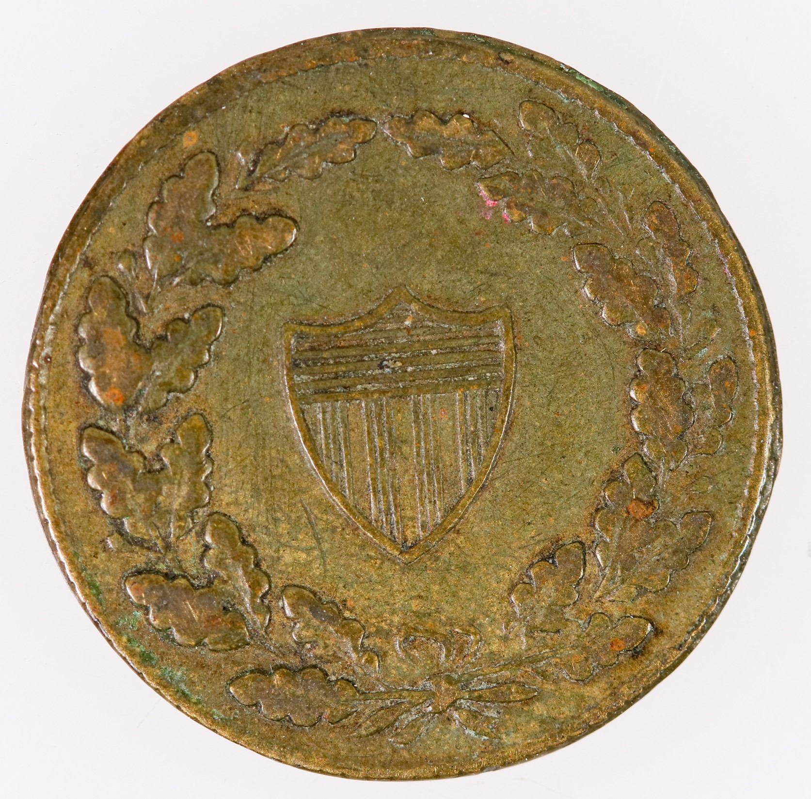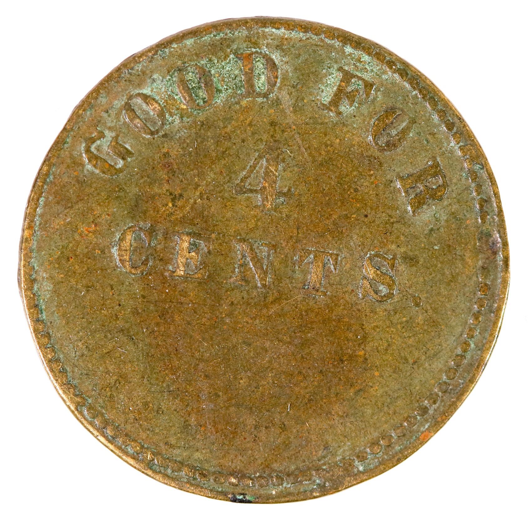 Union Shield with wreath // Good For / 4 / Cents. Br. ,rd., 17 mm. Dime sized!