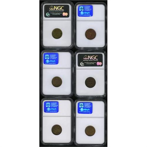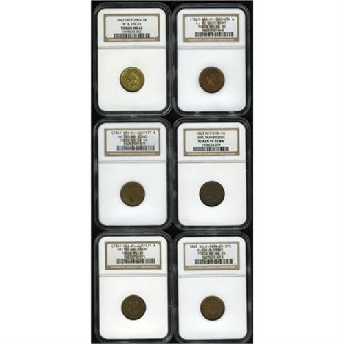 <B>Civil War Token Group.</B></I> Merchant store cards and patriotics combined: an <B>1863 Alden & Frink, Cohoes, NY, Fuld-NY-140A-2a, R.1, MS64 Red and Brown NGC,</B></I> much luster and plum-blue gorgeous patina; an <B>1862 W.B. Eager, Elyria, OH, Fuld-OH-290A-1b, R.2, MS62 NGC,</B></I> brass, light spotting on the reverse; an <B>1863 Wm. Frankfurth, Milwaukee, WI, Fuld-WI-510L-1a, VF35 NGC; (1861-65) United We Stand, Fuld 450/471A, MS63 Red and Brown NGC; (1861-65) United We Stand, Fuld-449/471A, R.2, MS65 NGC,</B></I> gorgeous Gem that should be designated Red and Brown; and an <B>(1861-65) I.O. U. 1 Cent, Fuld 390/434A, R.3, MS64 Red NGC,</B></I> choice and attractive. The MS60 catalog value is about $165. This lot should bring much more.<BR><BR><b>Shipping:</b> Coins & Currency (<a target="_blank" href="http://www.heritageauctions.com/common/shipping.php">view shipping information</a>)